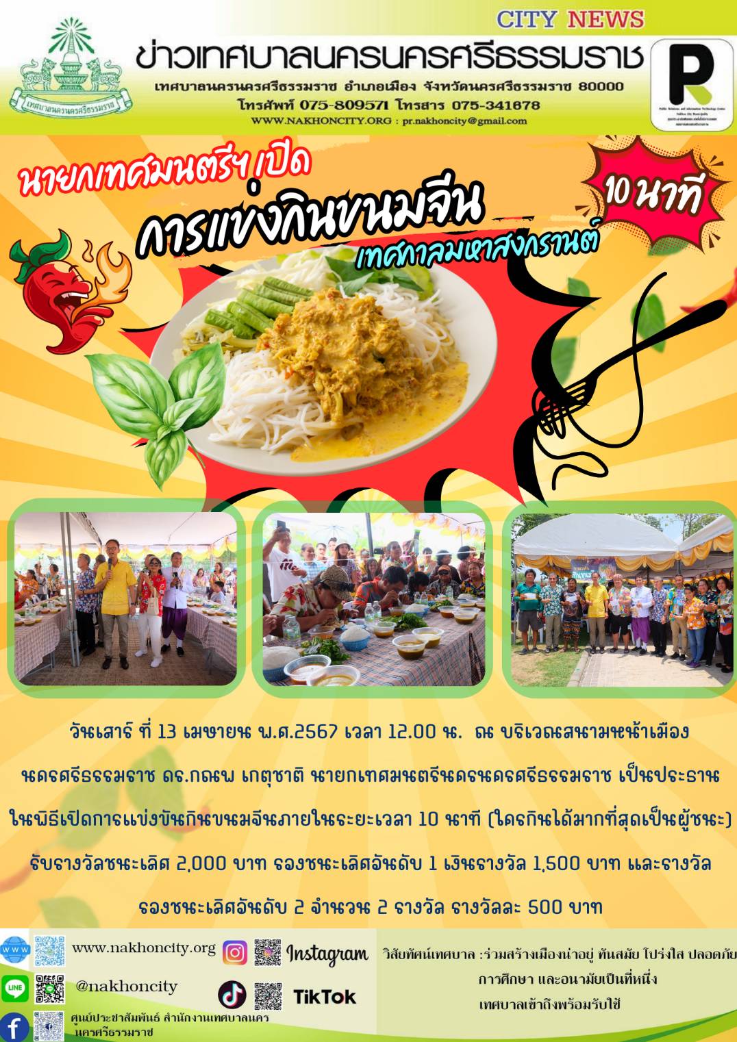วันเสาร์ ที่ 13 เมษายน พ.ศ.2567 เวลา 12.00 น. ณ บริเวณสนามหน้าเมืองนครศรีธรรมราช ดร.กณพ เกตุชาติ นายกเทศมนตรีนครนครศรีธรรมราช เป็นประธานในพิธีเปิดการแข่งขันกินขนมจีนภายในระยะเวลา 10 นาที (ใครกินได้มากที่สุดเป็นผู้ชนะ) รับรางวัลชนะเลิศ 2,000 บาท รองชนะเลิศอันดับ 1 เงินรางวัล 1,500 บาท และรางวัลรองชนะเลิศอันดับ 2 จำนวน 2 รางวัล รางวัลละ 500 บาท ............. ภาพ//ข่าว//จันทร์จิรา |
