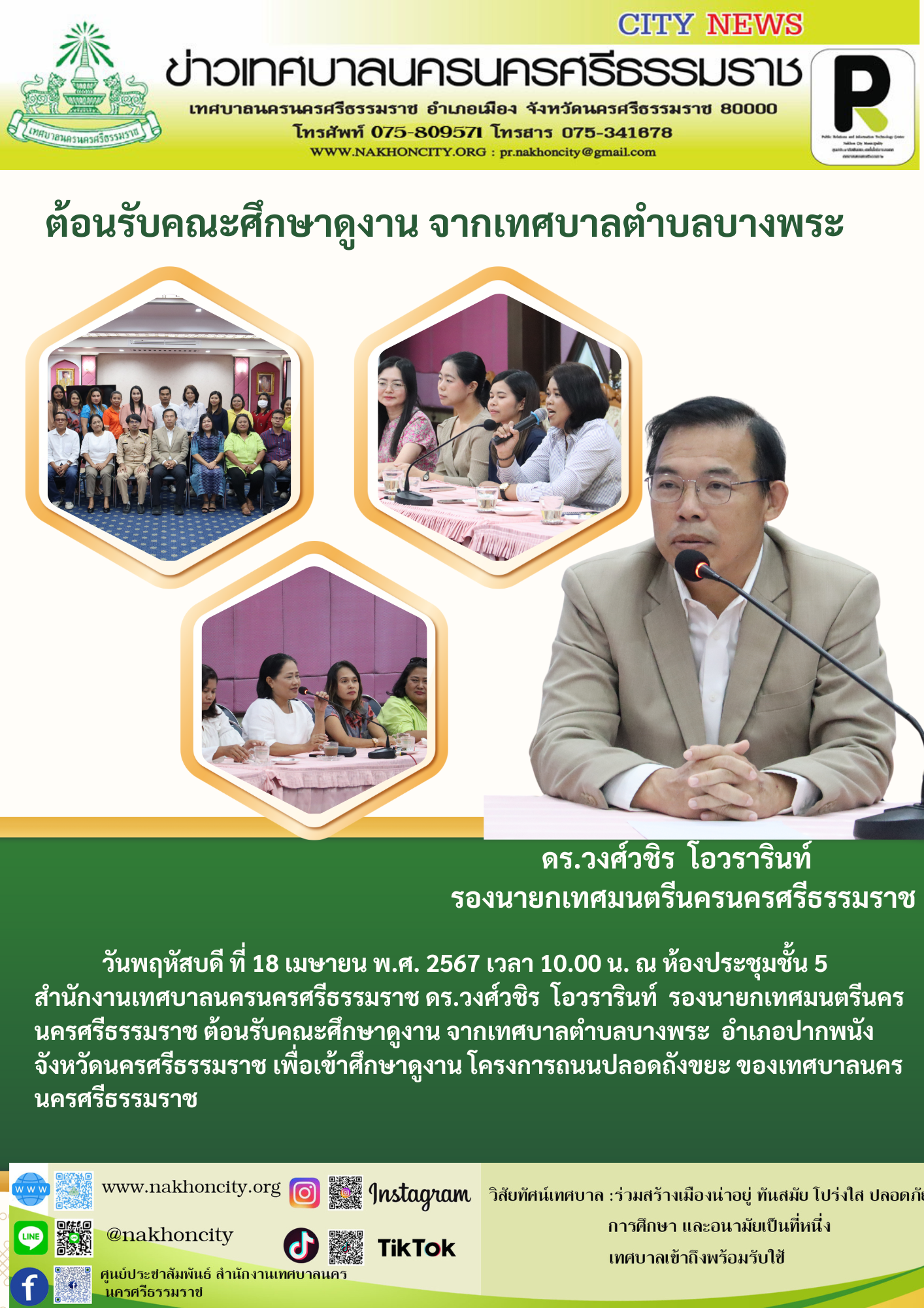 ดร.วงศ์วชิร โอวรารินท์ รองนายกเทศมนตรีนครนครศรีธรรมราช ต้อนรับคณะศึกษาดูงาน จากเทศบาลตำบลบางพระ อำเภอปากพนัง จังหวัดนครศรีธรรมราช |