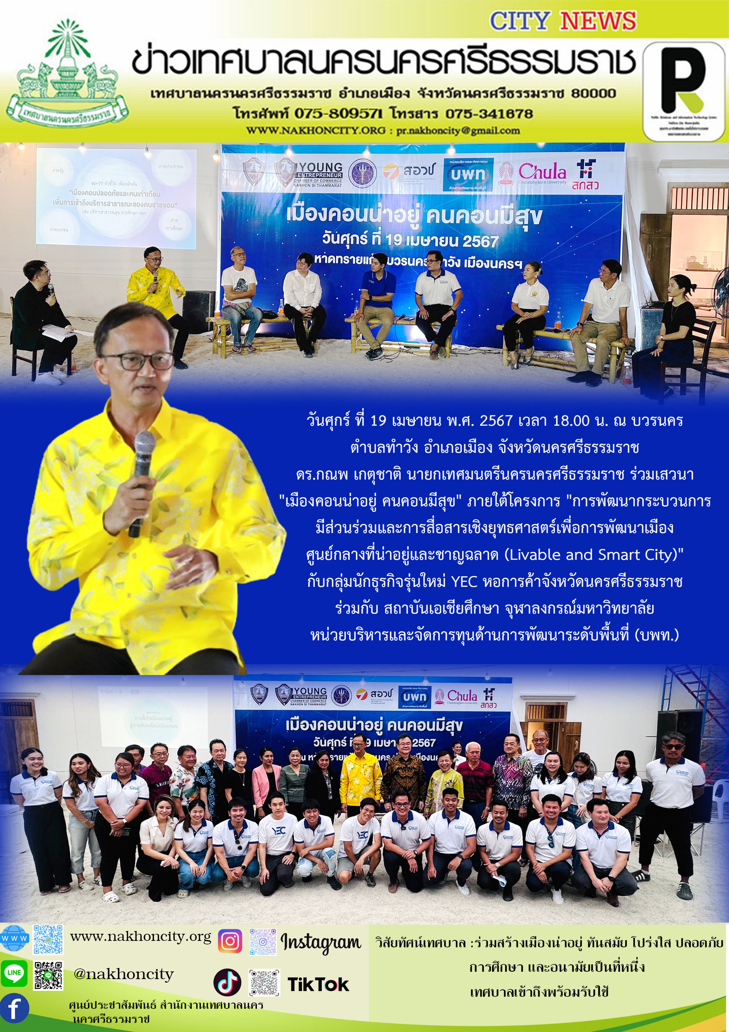 ดร.กณพ เกตุชาติ นายกเทศมนตรีนครนครศรีธรรมราชร่วมเสวนา "เมืองคอนน่าอยู่ คนคอนมีสุข" ภายใต้โครงการ "การพัฒนากระบวนการมีส่วนร่วมและการสื่อสารเชิงยุทธศาสตร์เพื่อการพัฒนาเมืองศูนย์กลางที่น่าอยู่และชาญฉลาด (Livable and Smart City)" |