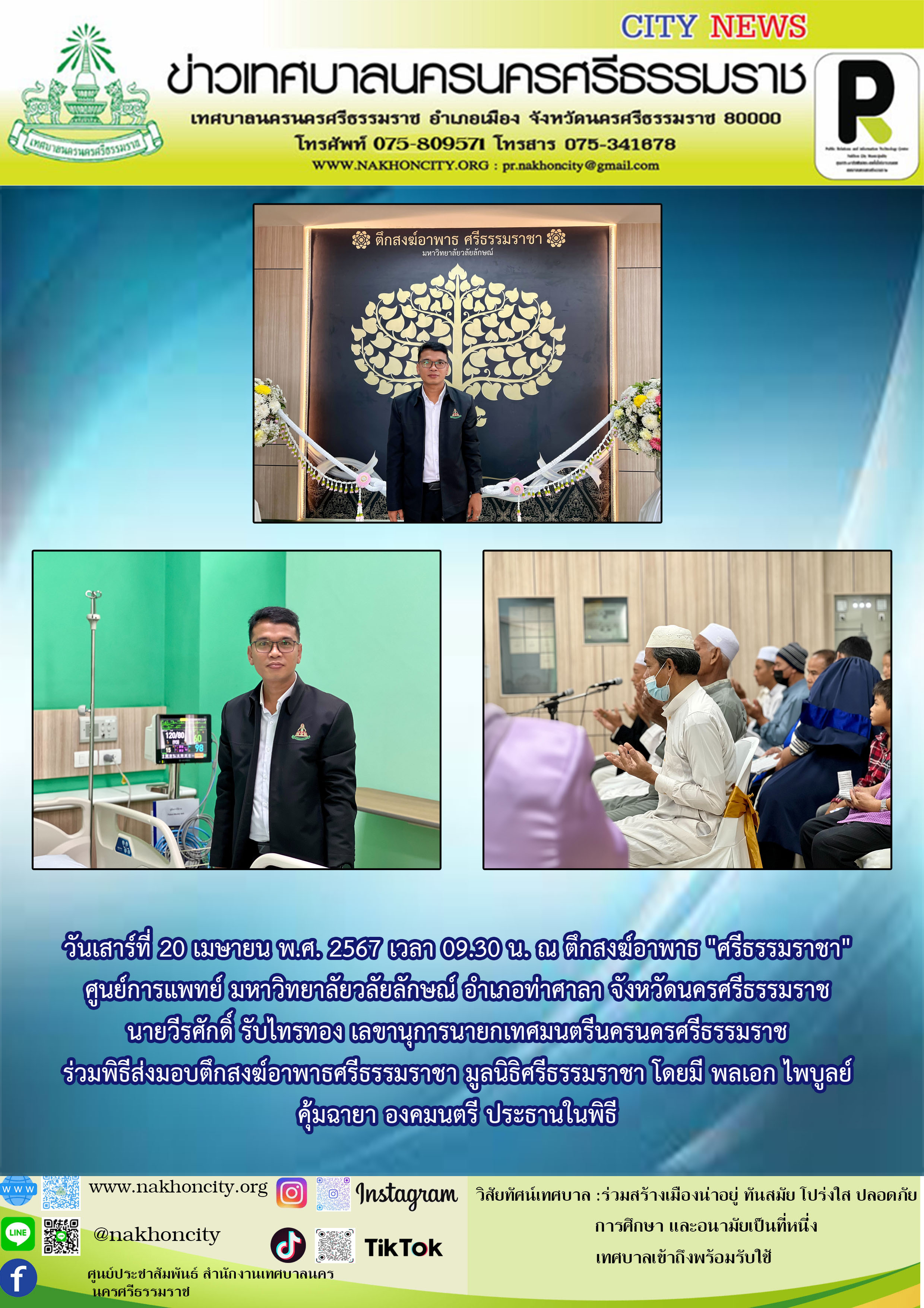 วันเสาร์ที่ 20 เมษายน พ.ศ. 2567 เวลา 09.30 น. ณ ตึกสงฆ์อาพาธ "ศรีธรรมราชา" ศูนย์การแพทย์ มหาวิทยาลัยวลัยลักษณ์ อำเภอท่าศาลา จังหวัดนครศรีธรรมราช ภาพ//ข่าว//ไกรสิทธิ |