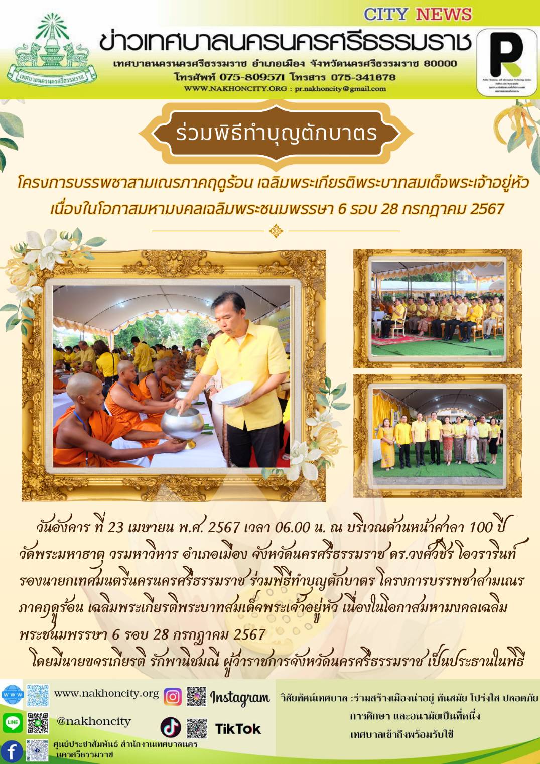 วันอังคาร ที่ 23 เมษายน พ.ศ. 2567 เวลา 06.00 น. ณ บริเวณด้านหน้าศาลา 100 ปี วัดพระมหาธาตุ วรมหาวิหาร อำเภอเมือง จังหวัดนครศรีธรรมราช ดร.วงศ์วชิร โอวรารินท์ รองนายกเทศมนตรีนครนครศรีธรรมราช ร่วมพิธีทำบุญตักบาตร โครงการบรรพชาสามเณรภาคฤดูร้อน เฉลิมพระเกียรติพระบาทสมเด็จพระเจ้าอยู่หัว เนื่องในโอกาสมหามงคลเฉลิมพระชนมพรรษา 6 รอบ 28 กรกฎาคม 2567 โดยมีนายขจรเกียรติ รักพานิชมณี ผู้ว่าราชการจังหวัดนครศรีธรรมราช เป็นประธานในพิธี ……….. ภาพ//ข่าว//จันทร์จิรา |