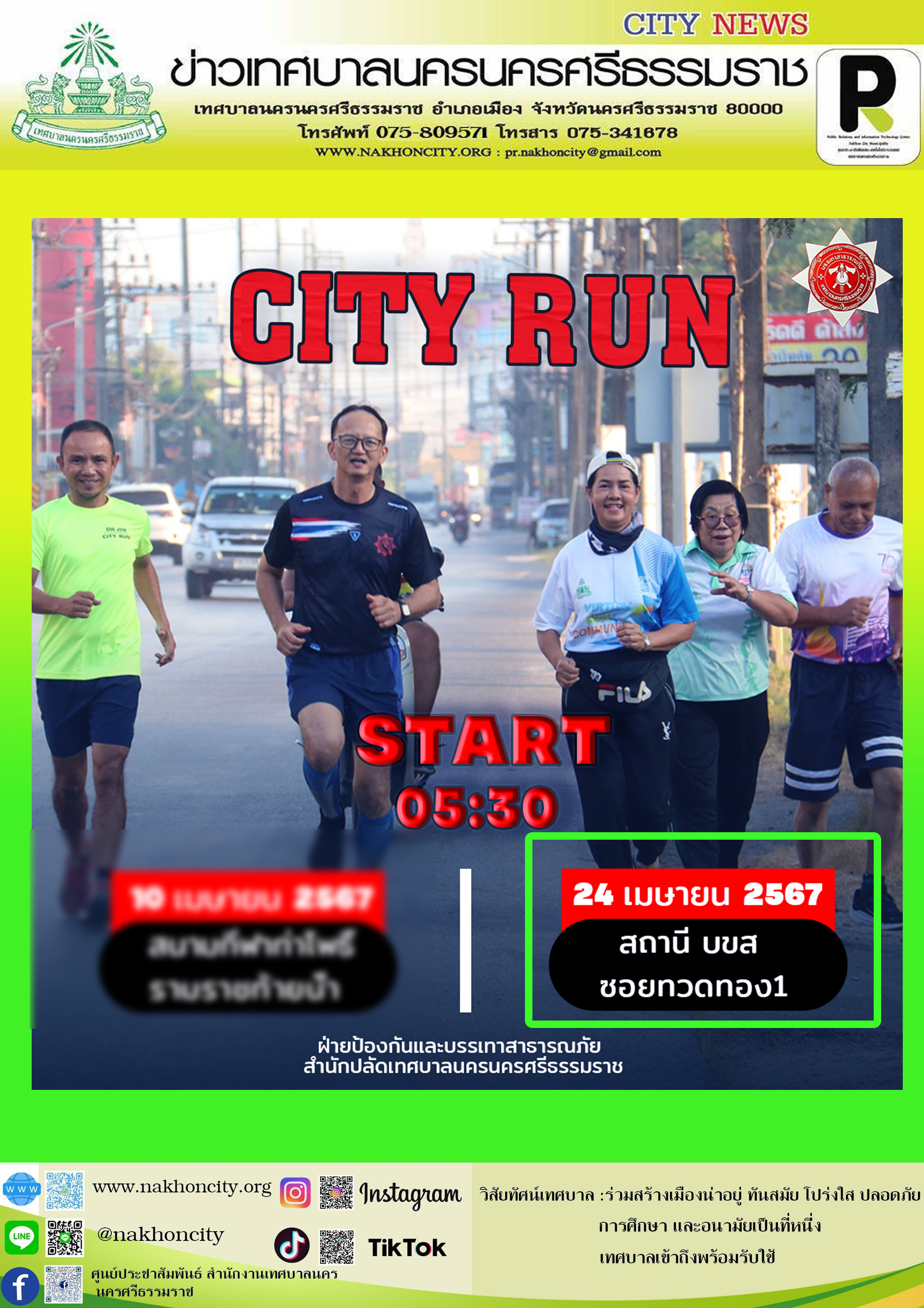 เทศบาลนครนครศรีธรรมราช ขอเชิญประชาชนร่วมกิจกรรม วิ่ง “City Run วันพุธ” วันพุธที่ 24 เมษายน พ.ศ.2567 เวลา 05.30 น. ณ จุดนัดพบ สถานีขนส่งผู้โดยสาร (บขส.) |