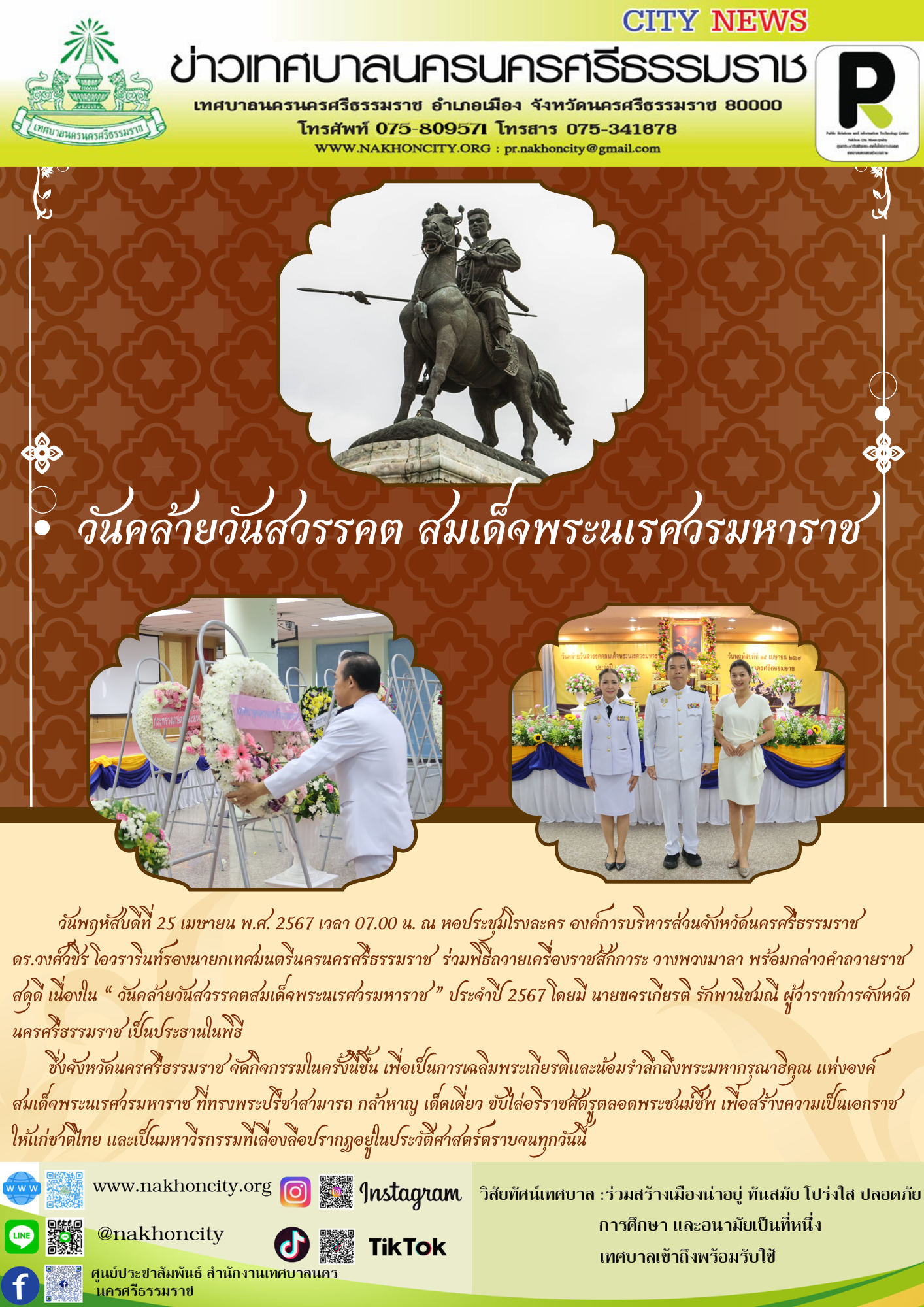 ดร.วงศ์วชิร โอวรารินท์ รองนายกเทศมนตรีนครนครศรีธรรมราช ร่วมพิธีถวายเครื่องราชสักการะ วางพวงมาลา พร้อมกล่าวคำถวายราชสดุดี เนื่องใน “ วันคล้ายวันสวรรคตสมเด็จพระนเรศวรมหาราช ” ประจำปี 2567 |