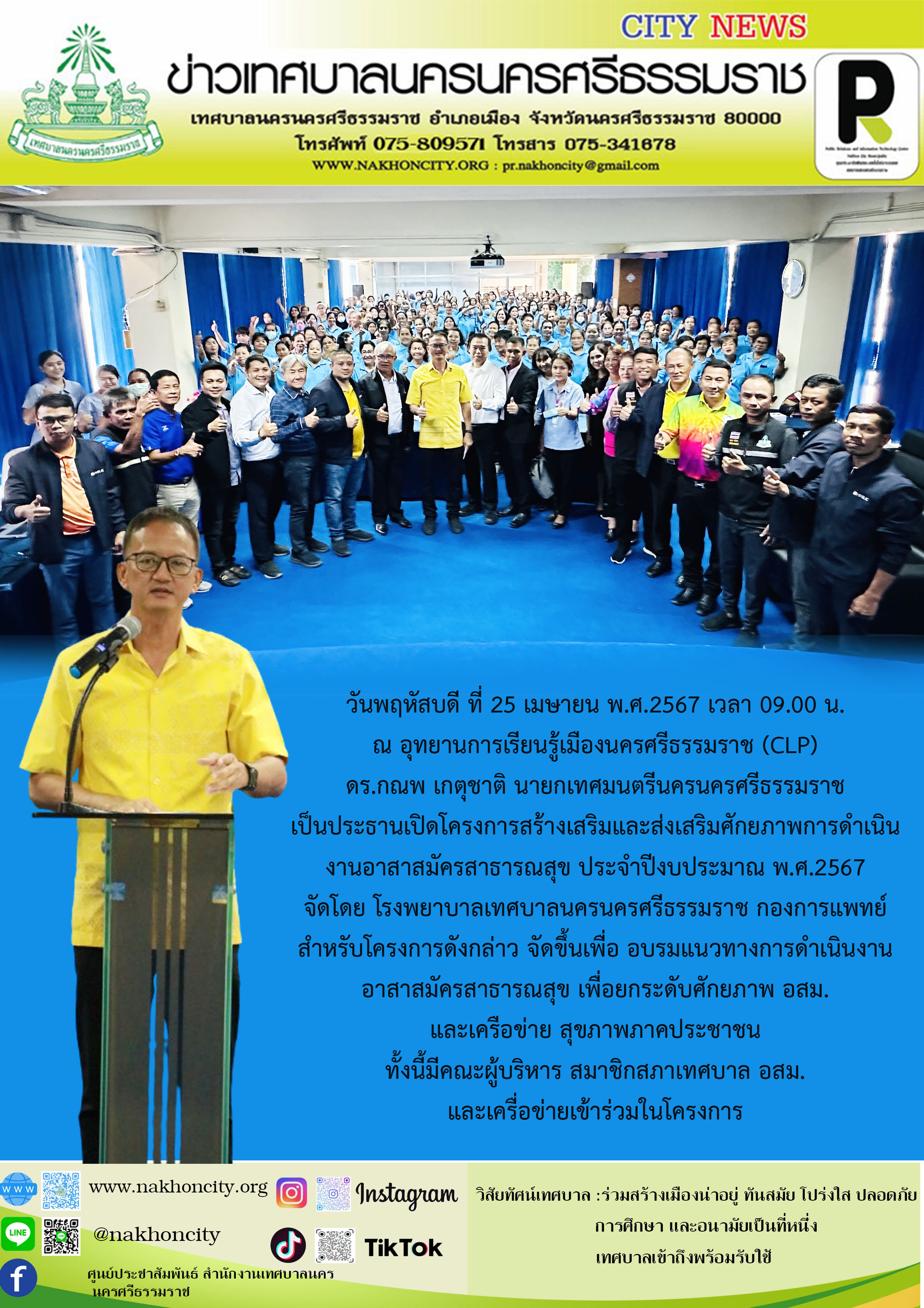 ดร.กณพ เกตุชาติ นายกเทศมนตรีนครนครศรีธรรมราช เป็นประธานเปิดโครงการสร้างเสริมและส่งเสริมศักยภาพการดำเนินงานอาสาสมัครสาธารณสุข ประจำปีงบประมาณ พ.ศ.2567 |