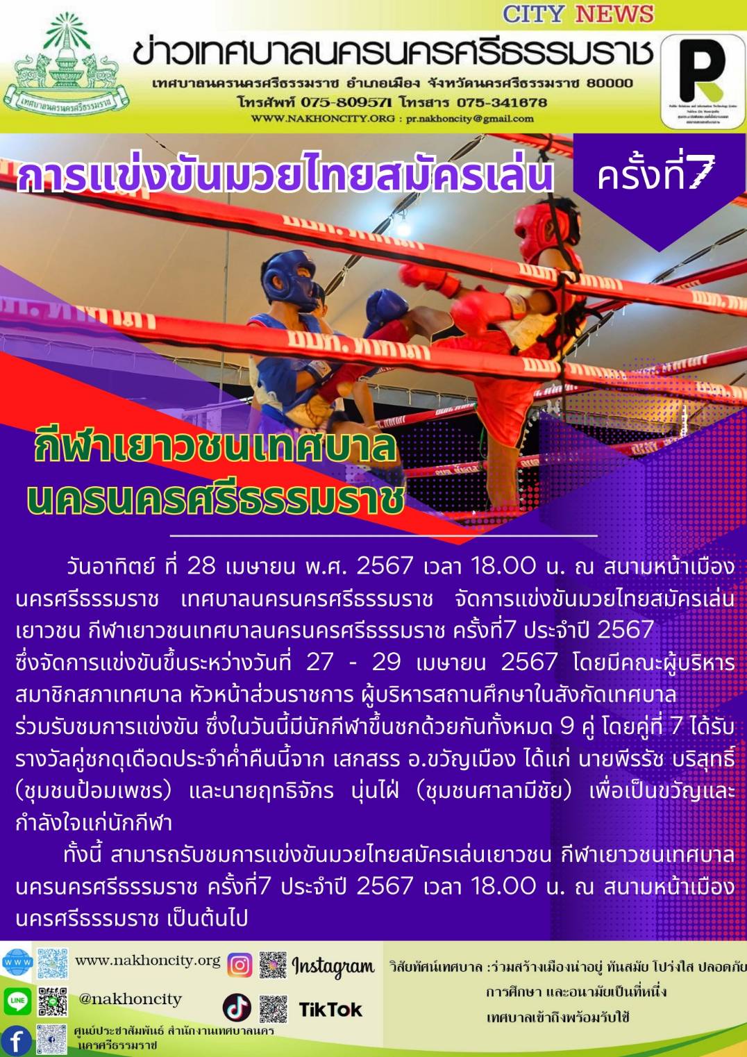 เทศบาลนครนครศรีธรรมราช จัดการแข่งขันกีฬามวยไทยสมัครเล่นเยาวชน กีฬาเยาวชนเทศบาลนครนครศรีธรรมราช ครั้งที่7 ประจำปี 2567 |