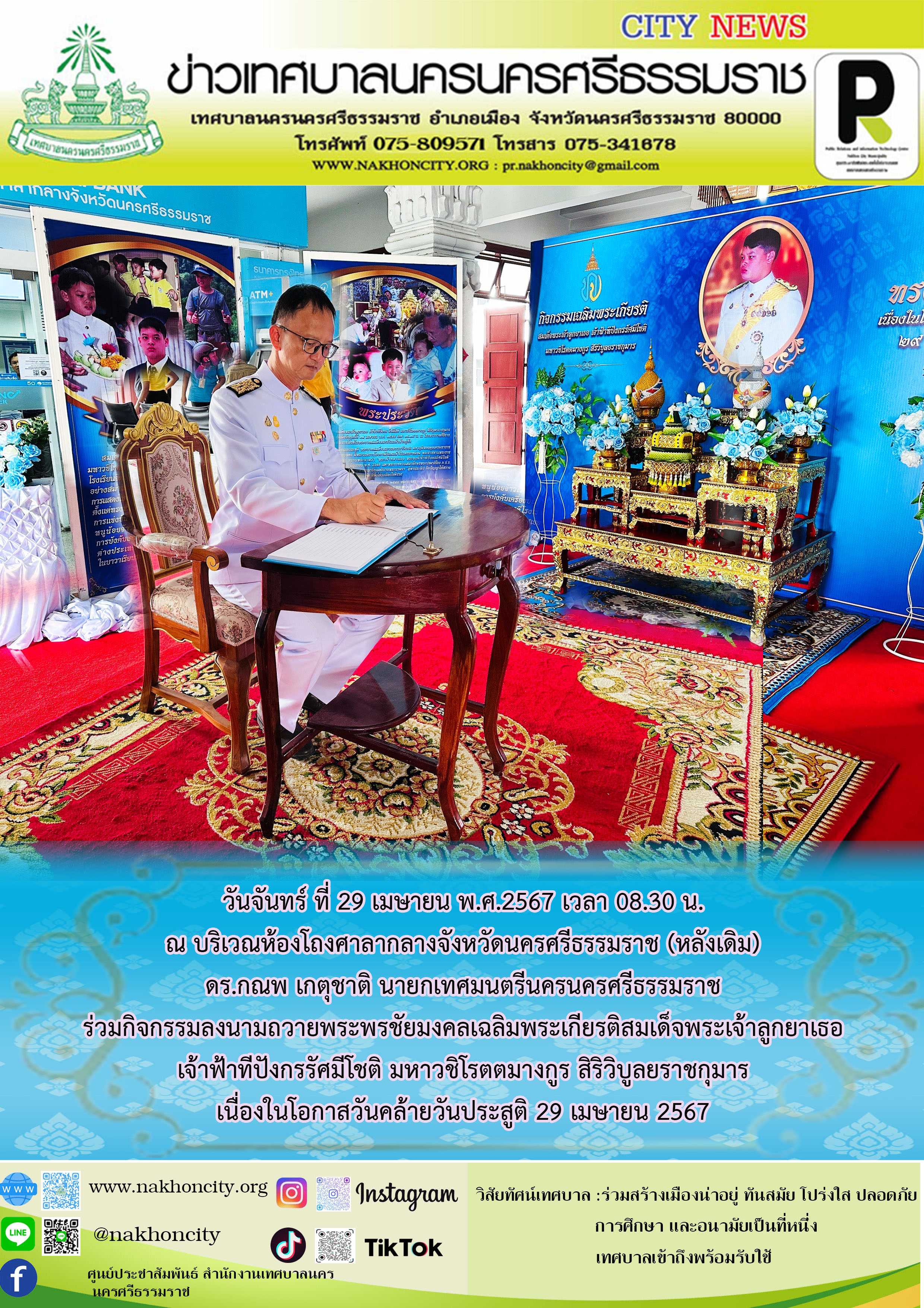 ดร.กณพ เกตุชาติ นายกเทศมนตรีนครนครศรีธรรมราช ร่วมกิจกรรมลงนามถวายพระพรชัยมงคลเฉลิมพระเกียรติสมเด็จพระเจ้าลูกยาเธอ เจ้าฟ้าทีปังกรรัศมีโชติ มหาวชิโรตตมางกูร สิริวิบูลยราชกุมาร เนื่องในโอกาสวันคล้ายวันประสูติ 29 เมษายน 2567 |