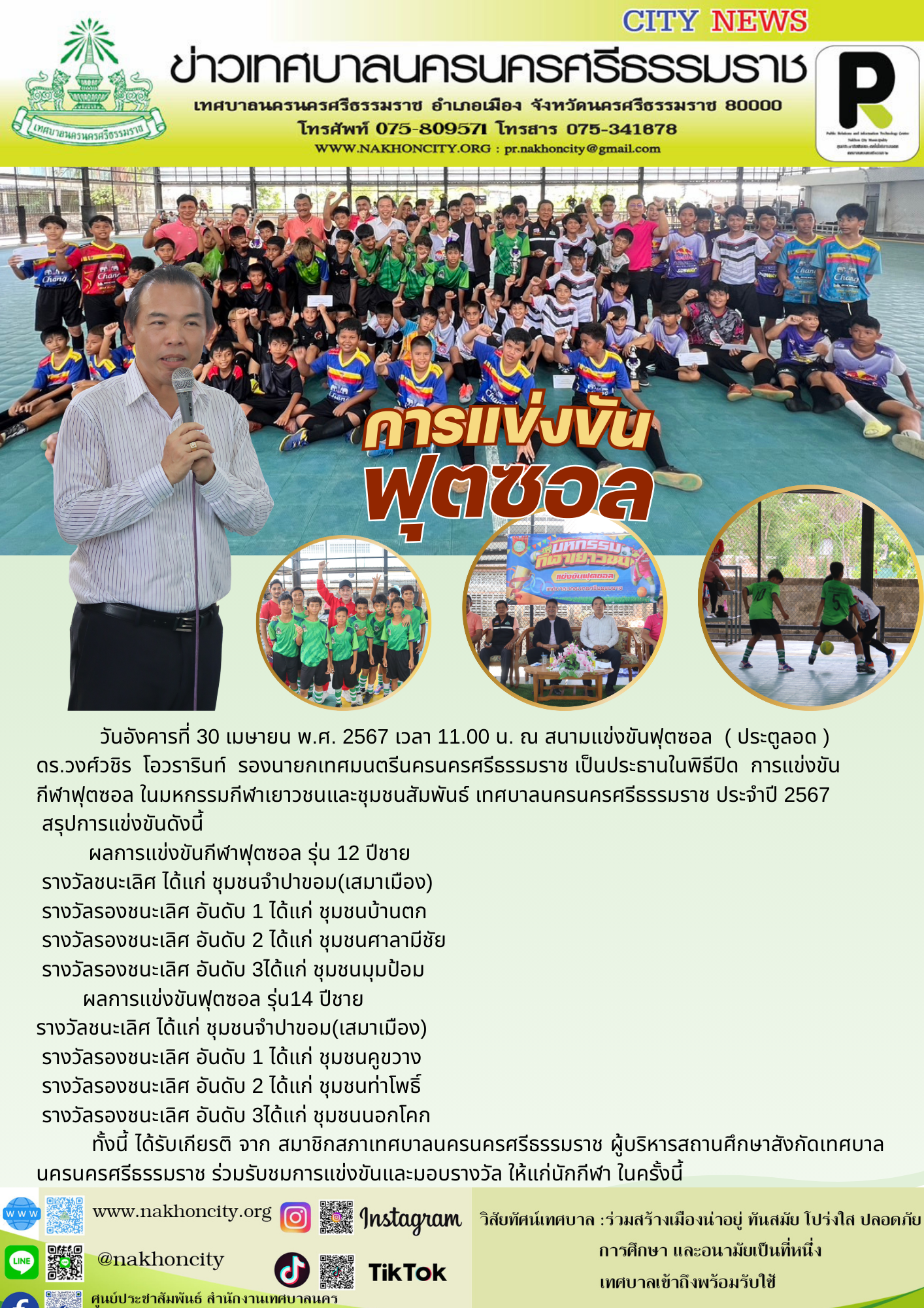 วันอังคารที่ 30 เมษายน พ.ศ. 2567 เวลา 11.00 น. ณ สนามแข่งขันฟุตซอล ( ประตูลอด ) ดร.วงศ์วชิร โอวรารินท์ รองนายกเทศมนตรีนครนครศรีธรรมราช เป็นประธานในพิธีปิด การแข่งขัน กีฬา ฟุตซอล ในมหกรรมกีฬาเยาวชนและชุมชนสัมพันธ์ เทศบาลนครนครศรีธรรมราช ประจำปี 2567 สรุปการแข่งขันดังนี้ ผลการแข่งขันกีฬาฟุตซอล รุ่น 12 ปีชาย รางวัลชนะเลิศ ได้แก่ ชุมชนจำปาขอม(เสมาเมือง) รางวัลรองชนะเลิศ อันดับ 1 ได้แก่ ชุมชนบ้านตก รางวัลรองชนะเลิศ อันดับ 2 ได้แก่ ชุมชนศาลามีชัย รางวัลรองชนะเลิศ อันดับ 3ได้แก่ ชุมชนมุมป้อม ผลการแข่งขันฟุตซอล รุ่น14 ปีชาย รางวัลชนะเลิศ ได้แก่ ชุมชนจำปาขอม(เสมาเมือง) รางวัลรองชนะเลิศ อันดับ 1 ได้แก่ ชุมชนคูขวาง รางวัลรองชนะเลิศ อันดับ 2 ได้แก่ ชุมชนท่าโพธิ์ รางวัลรองชนะเลิศ อันดับ 3ได้แก่ ชุมชนนอกโคก ทั้งนี้ ได้รับเกียรติ จาก สมาชิกสภาเทศบาลนครนครศรีธรรมราช ผู้บริหารสถานศึกษาสังกัดเทศบาลนครนครศรีธรรมราช ร่วมรับชมการแข่งขันและมอบรางวัล ให้แก่นักกีฬา ในครั้งนี้