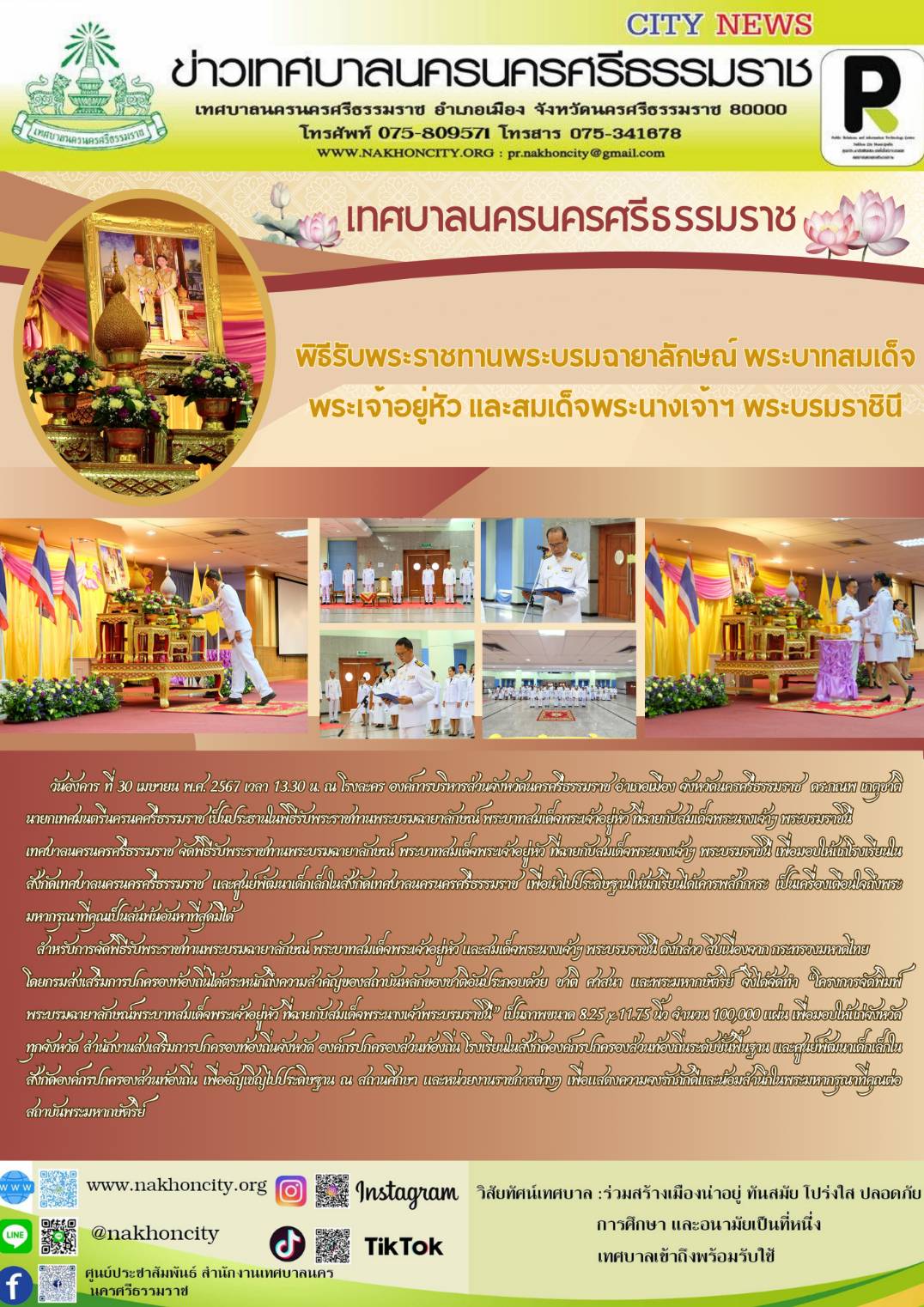 เทศบาลนครนครศรีธรรมราช จัดพิธีรับพระราชทานพระบรมฉายาลักษณ์ พระบาทสมเด็จพระเจ้าอยู่หัว และสมเด็จพระนางเจ้าฯ พระบรมราชินี |