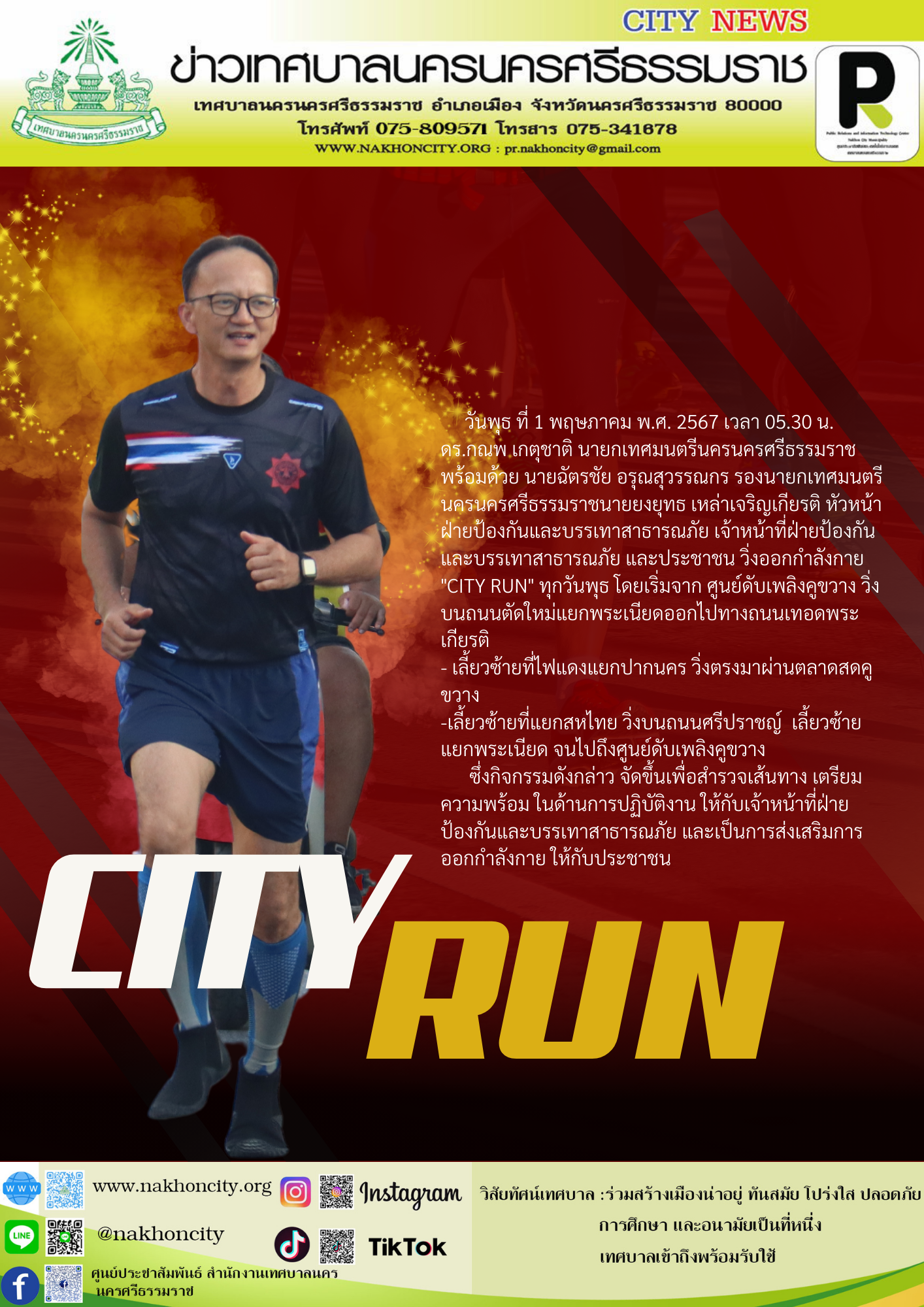 ดร.กณพ เกตุชาติ นายกเทศมนตรีนครนครศรีธรรมราช พร้อมด้วย นายฉัตรชัย อรุณสุวรรณกร รองนายกเทศมนตรีนครนครศรีธรรมราชนายยงยุทธ เหล่าเจริญเกียรติ หัวหน้าฝ่ายป้องกันและบรรเทาสาธารณภัย เจ้าหน้าที่ฝ่ายป้องกันและบรรเทาสาธารณภัย และประชาชน วิ่งออกกำลังกาย "CITY RUN" |