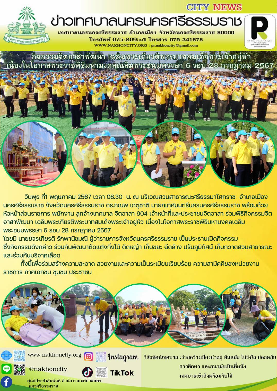 ดร.กณพ เกตุชาติ นายกเทศมนตรีนครนครศรีธรรมราช ร่วมกิจกรรมจิตอาสาพัฒนา เฉลิมพระเกียรติพระบาทสมเด็จพระเจ้าอยู่หัว เนื่องในโอกาสพระราชพิธีมหามงคลเฉลิมพระชนมพรรษา 6 รอบ 28 กรกฎาคม 2567 |