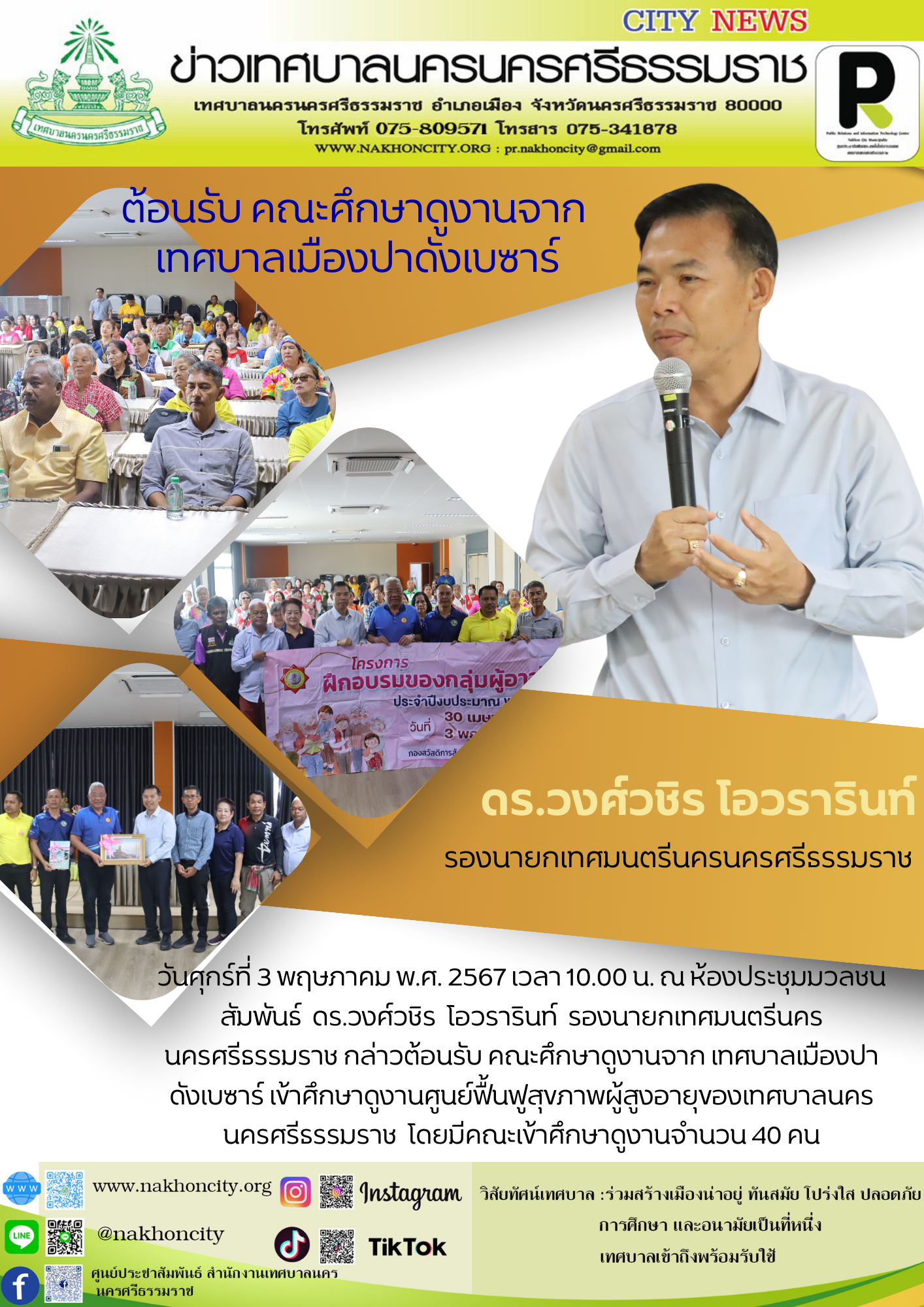 วันศุกร์ที่ 3 พฤษภาคม พ.ศ. 2567 เวลา 10.00 น. ณ ห้องประชุมมวลชนสัมพันธ์ ดร.วงศ์วชิร โอวรารินท์ รองนายกเทศมนตรีนครนครศรีธรรมราช กล่าวต้อนรับ คณะศึกษาดูงานจาก เทศบาลเมืองปาดังเบซาร์ เข้าศึกษาดูงานศูนย์ฟื้นฟูสุขภาพผู้สูงอายุของเทศบาลนครนครศรีธรรมราช โดยมีคณะเข้าศึกษาดูงานจำนวน 40 คน |