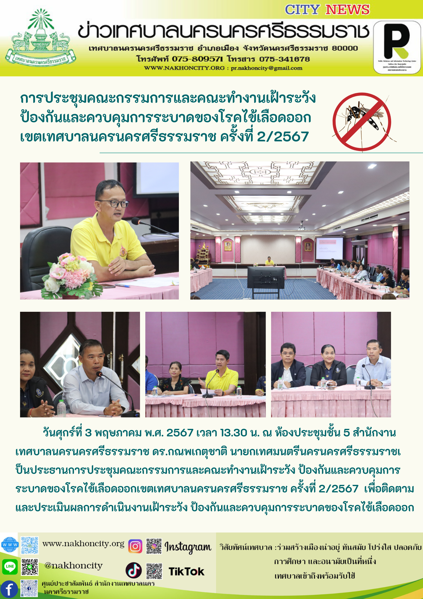 วันศุกร์ที่ 3 พฤษภาคม พ.ศ. 2567 เวลา 13.30 น. ณ ห้องประชุมชั้น 5 สำนักงานเทศบาลนครนครศรีธรรมราช ดร.กณพ เกตุชาติ นายกเทศมนตรีนครนครศรีธรรมราช เป็นประธานการประชุมคณะกรรมการและคณะทำงานเฝ้าระวัง ป้องกันและควบคุมการระบาดของโรคไข้เลือดออกเขตเทศบาลนครนครศรีธรรมราช ครั้งที่ 2/2567 เพื่อติดตามและประเมินผลการดำเนินงานเฝ้าระวัง ป้องกันและควบคุมการระบาดของโรคไข้เลือดออก