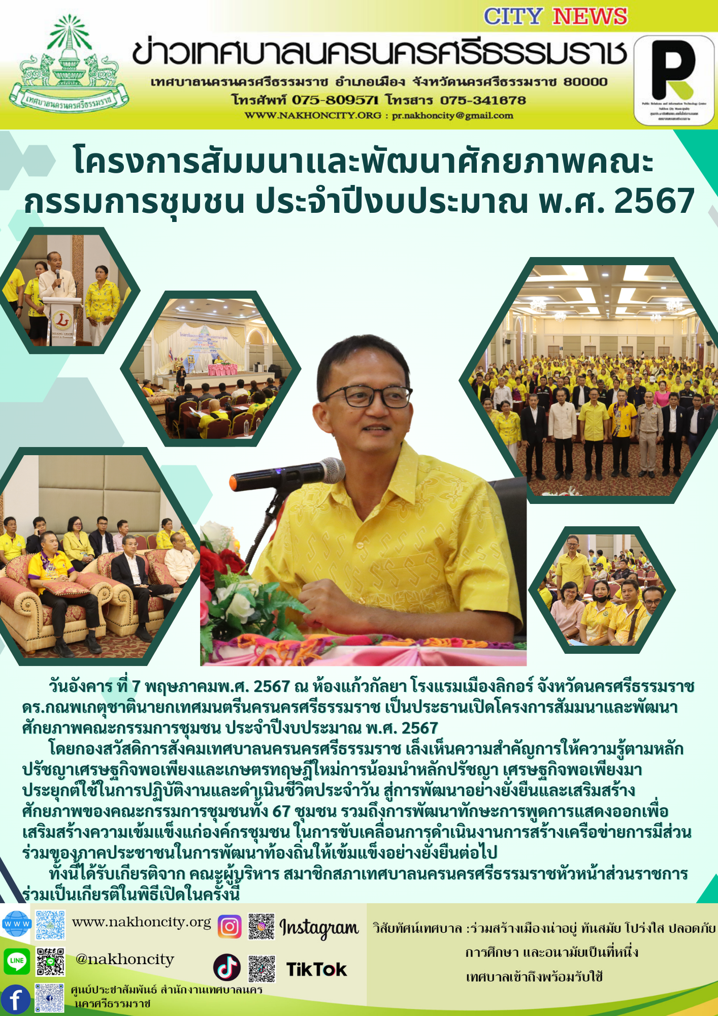 ดร.กณพ เกตุชาติ นายกเทศมนตรีนครนครศรีธรรมราช เป็นประธานเปิดโครงการสัมมนาและพัฒนาศักยภาพคณะกรรมการชุมชน ประจำปีงบประมาณ พ.ศ. 2567 |