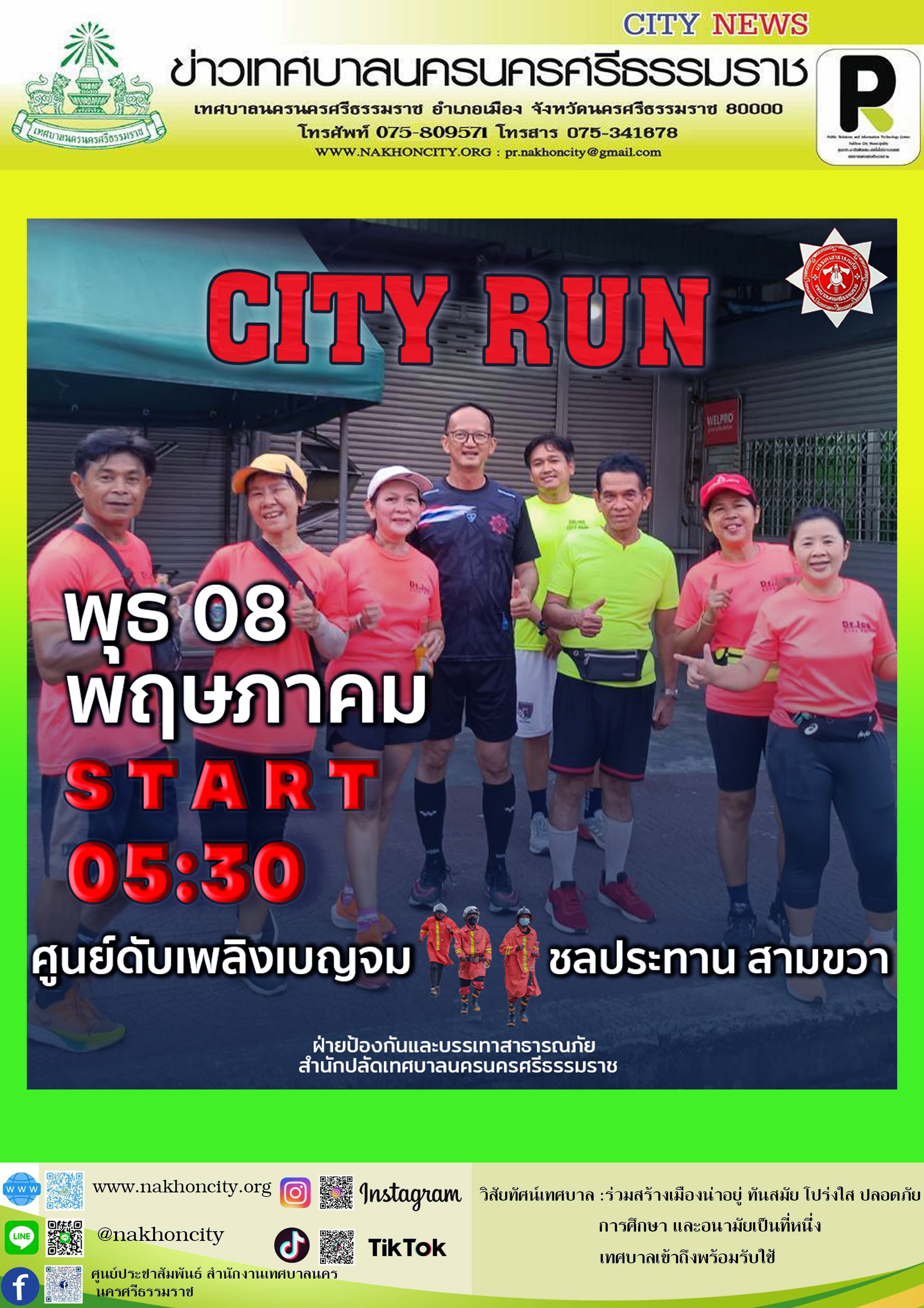 “City Run วันพุธ” วันพุธที่ 8 พฤษภาคม พ.ศ.2567 เวลา 05.30 น. ณ จุดนัดพบ พร้อมที่ศูนย์ดับเพลิงเบญจม |