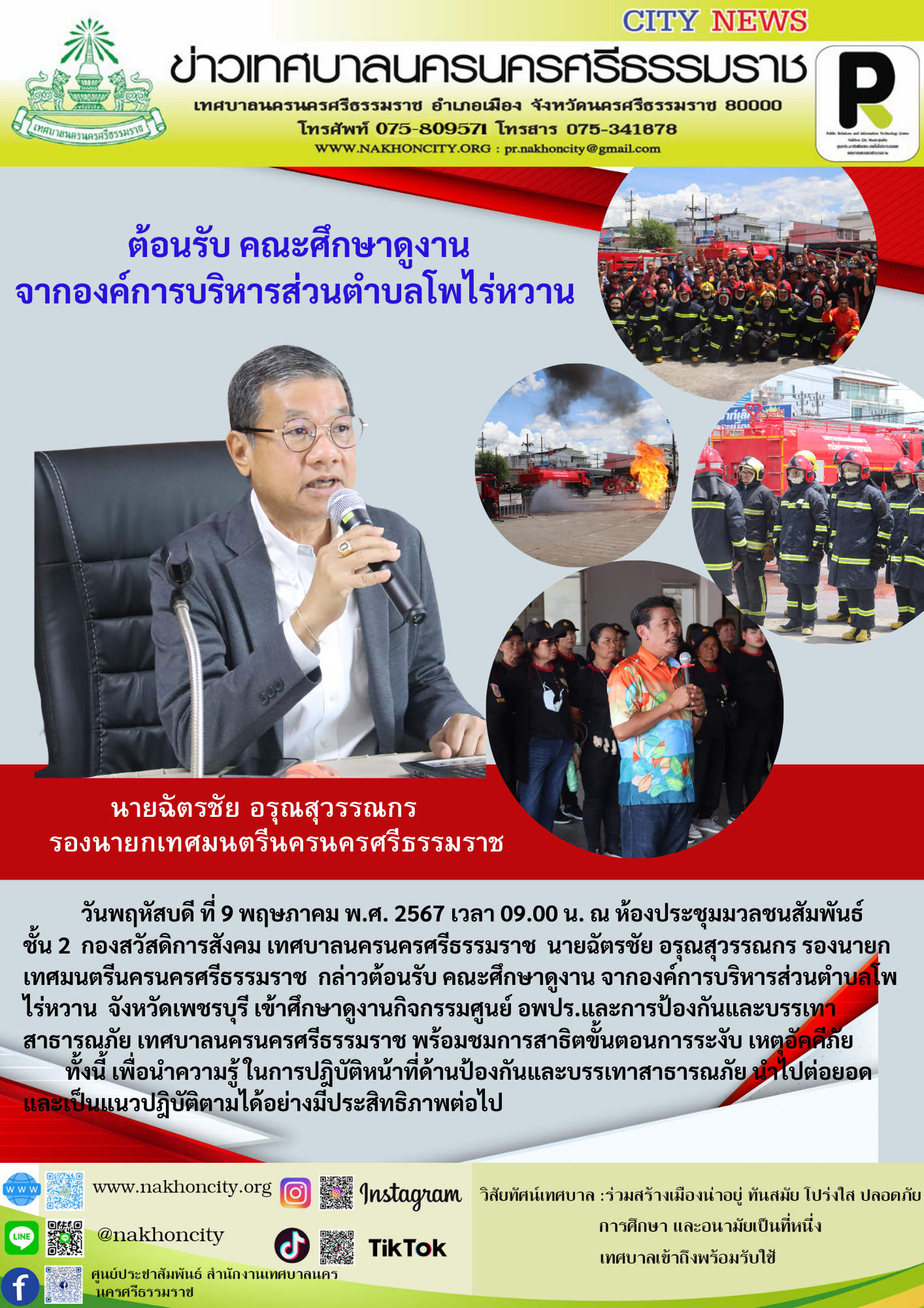วันพฤหัสบดี ที่ 9 พฤษภาคม พ.ศ. 2567 เวลา 09.00 น. ณ ห้องประชุมมวลชนสัมพันธ์ ชั้น 2 กองสวัสดิการสังคม เทศบาลนครนครศรีธรรมราช นายฉัตรชัย อรุณสุวรรณกร รองนายกเทศมนตรีนครนครศรีธรรมราช กล่าวต้อนรับ คณะศึกษาดูงาน จากองค์การบริหารส่วนตำบลโพไร่หวาน จังหวัดเพชรบุรี เข้าศึกษาดูงานกิจกรรมศูนย์ อพปร.และการป้องกันและบรรเทาสาธารณภัย เทศบาลนครนครศรีธรรมราช พร้อมชมการสาธิตขั้นตอนการระงับ เหตุอัคคีภัย ทั้งนี้ เพื่อนำความรู้ ในการปฎิบัติหน้าที่ด้านป้องกันและบรรเทาสาธารณภัย นำไปต่อยอดและเป็นแนวปฎิบัติตามได้อย่างมีประสิทธิภาพต่อไป |