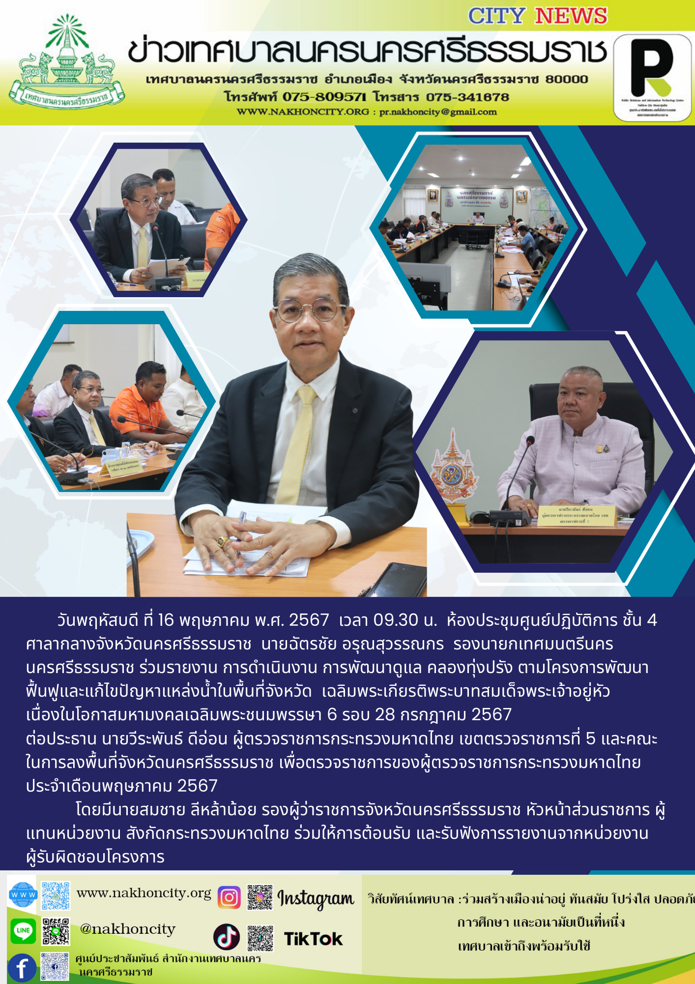 นายฉัตรชัย อรุณสุวรรณกร รองนายกเทศมนตรีนครนครศรีธรรมราช ร่วมรายงาน การดำเนินงาน การพัฒนาดูแล คลองทุ่งปรัง ตามโครงการพัฒนาฟื้นฟูและแก้ไขปัญหาแหล่งน้ำในพื้นที่จังหวัด เฉลิมพระเกียรติพระบาทสมเด็จพระเจ้าอยู่หัว เนื่องในโอกาสมหามงคลเฉลิมพระชนมพรรษา 6 รอบ 28 กรกฎาคม 2567 ต่อประธาน นายวีระพันธ์ ดีอ่อน ผู้ตรวจราชการกระทรวงมหาดไทย เขตตรวจราชการที่ 5 |