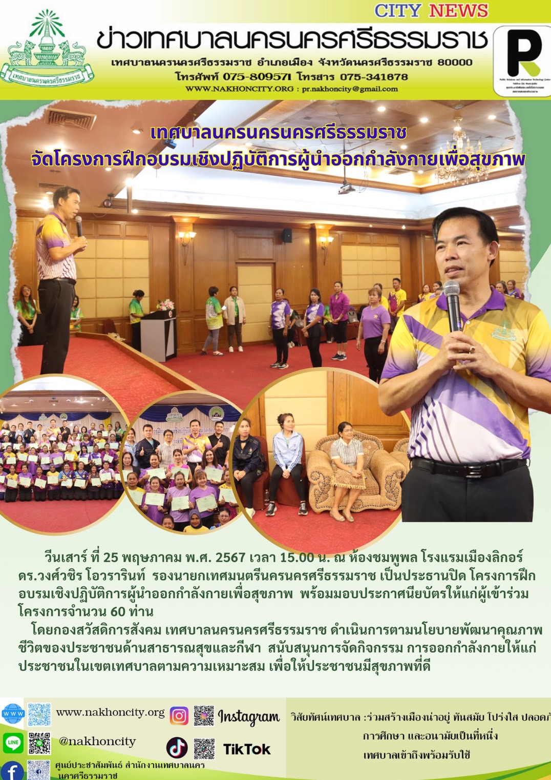 เทศบาลนครนครนครศรีธรรมราช จัดโครงการฝึกอบรมเชิงปฏิบัติการผู้นำออกกำลังกายเพื่อสุขภาพ วันเสาร์ ที่ 25 พฤษภาคม พ.ศ. 2567 เวลา 15.00 น. ณ ห้องชมพูพล โรงแรมเมืองลิกอร์ ดร.วงศ์วชิร โอวรารินท์ รองนายกเทศมนตรีนครนครศรีธรรมราช เป็นประธานปิด โครงการฝึกอบรมเชิงปฏิบัติการผู้นำออกกำลังกายเพื่อสุขภาพ พร้อมมอบประกาศนียบัตรให้แก่ผู้เข้าร่วมโครงการจำนวน 60 ท่าน โดยกองสวัสดิการสังคม เทศบาลนครนครศรีธรรมราช ดำเนินการตามนโยบายพัฒนาคุณภาพชีวิตของประชาชนด้านสาธารณสุขและกีฬา สนับสนุนการจัดกิจกรรม การออกกำลังกายให้แก่ประชาชนในเขตเทศบาลตามความเหมาะสม เพื่อให้ประชาชนมีสุขภาพที่ดี |
