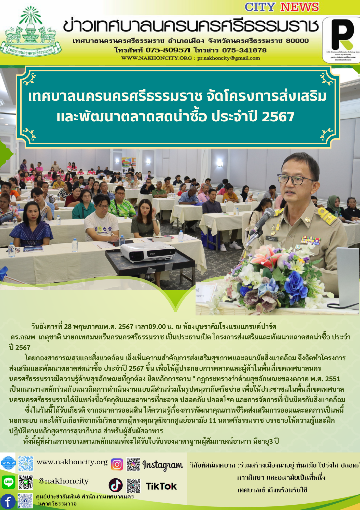 เทศบาลนครนครศรีธรรมราช จัดโครงการส่งเสริมและพัฒนาตลาดสดน่าซื้อ ประจำปี 2567 |