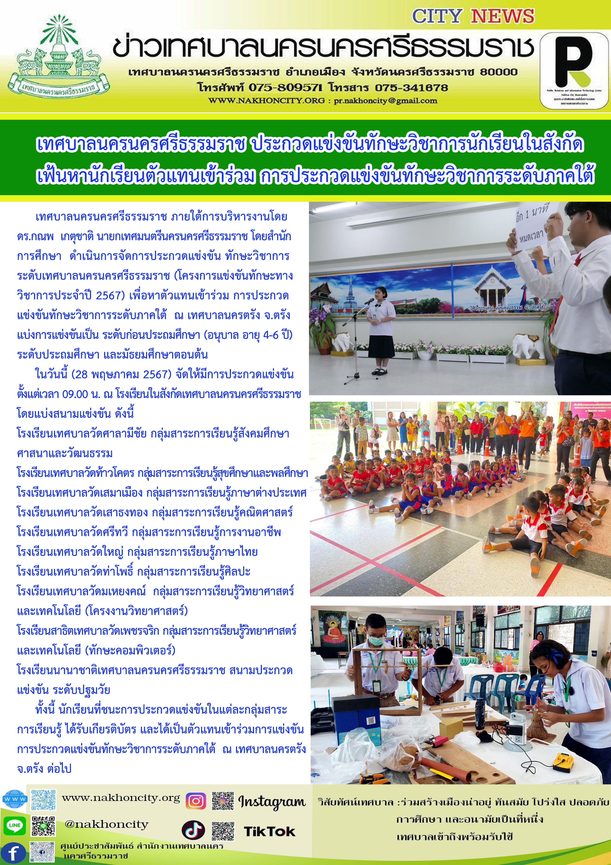 เทศบาลนครนครศรีธรรมราช ประกวดแข่งขันทักษะวิชาการนักเรียนในสังกัด เฟ้นหานักเรียนตัวแทนเข้าร่วม การประกวดแข่งขันทักษะวิชาการระดับภาคใต้ |