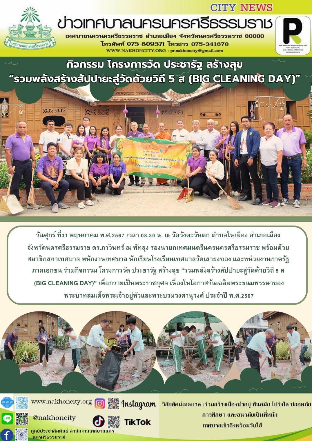 ดร.ภาวินทร์ ณ พัทลุง รองนายกเทศมนตรีนครนครศรีธรรมราช ร่วมกิจกรรม โครงการวัด ประชารัฐ สร้างสุข “รวมพลังสร้างสัปปายะสู่วัดด้วยวิถี 5 ส (Big Cleaning Day)” |