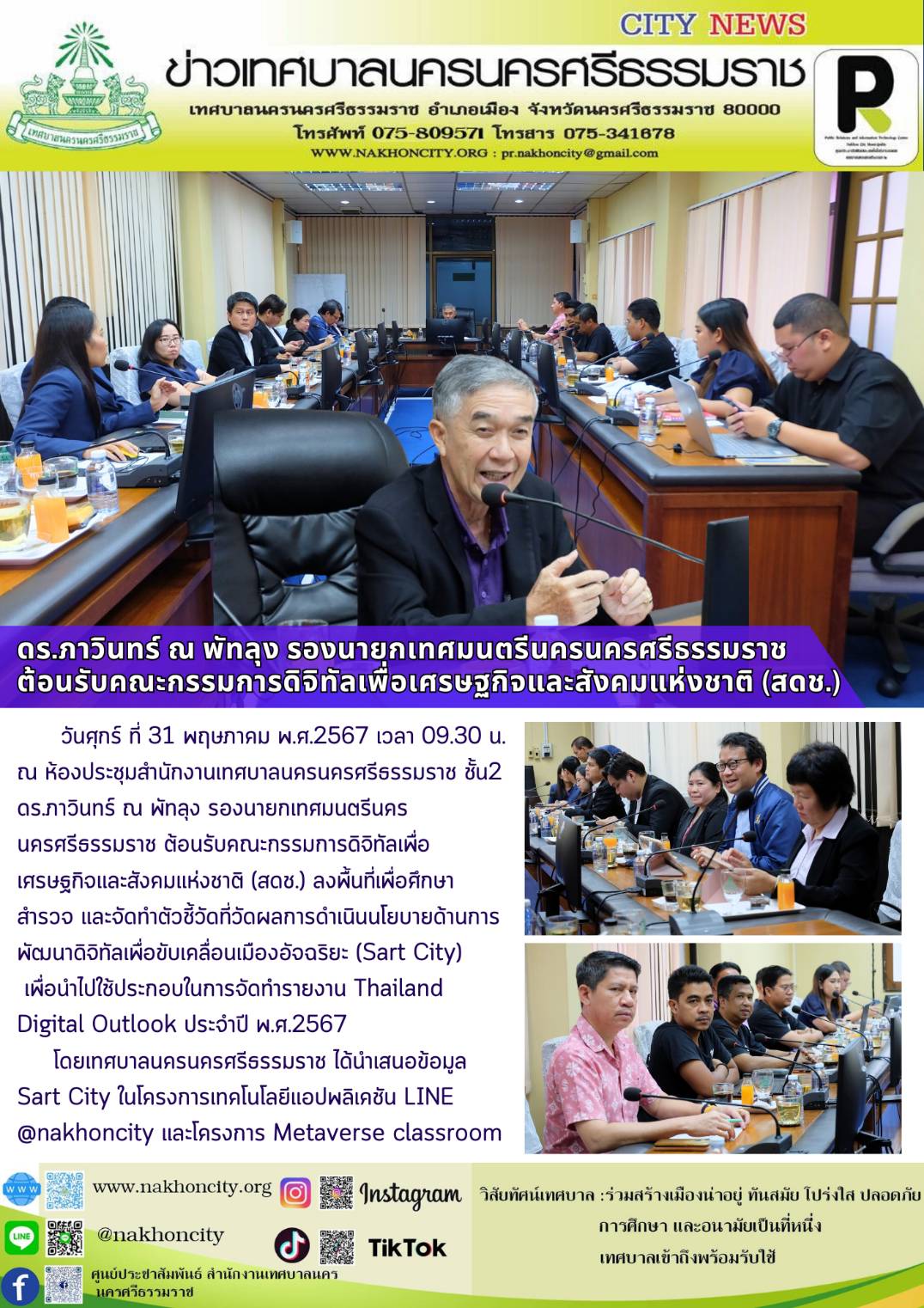 ดร.ภาวินทร์ ณ พัทลุง รองนายกเทศมนตรีนครนครศรีธรรมราช ต้อนรับคณะกรรมการดิจิทัลเพื่อเศรษฐกิจและสังคมแห่งชาติ (สดช.) |