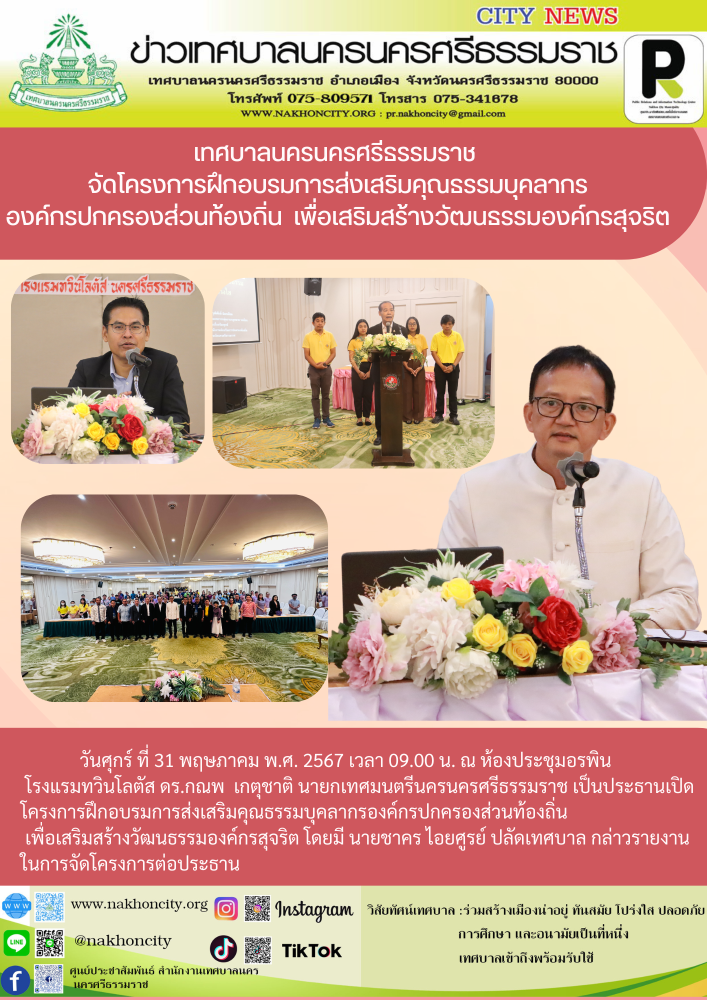 เทศบาลนครนครศรีธรรมราช จัดโครงการฝึกอบรมการส่งเสริมคุณธรรมบุคลากรองค์กรปกครองส่วนท้องถิ่น เพื่อเสริมสร้างวัฒนธรรมองค์กรสุจริต |