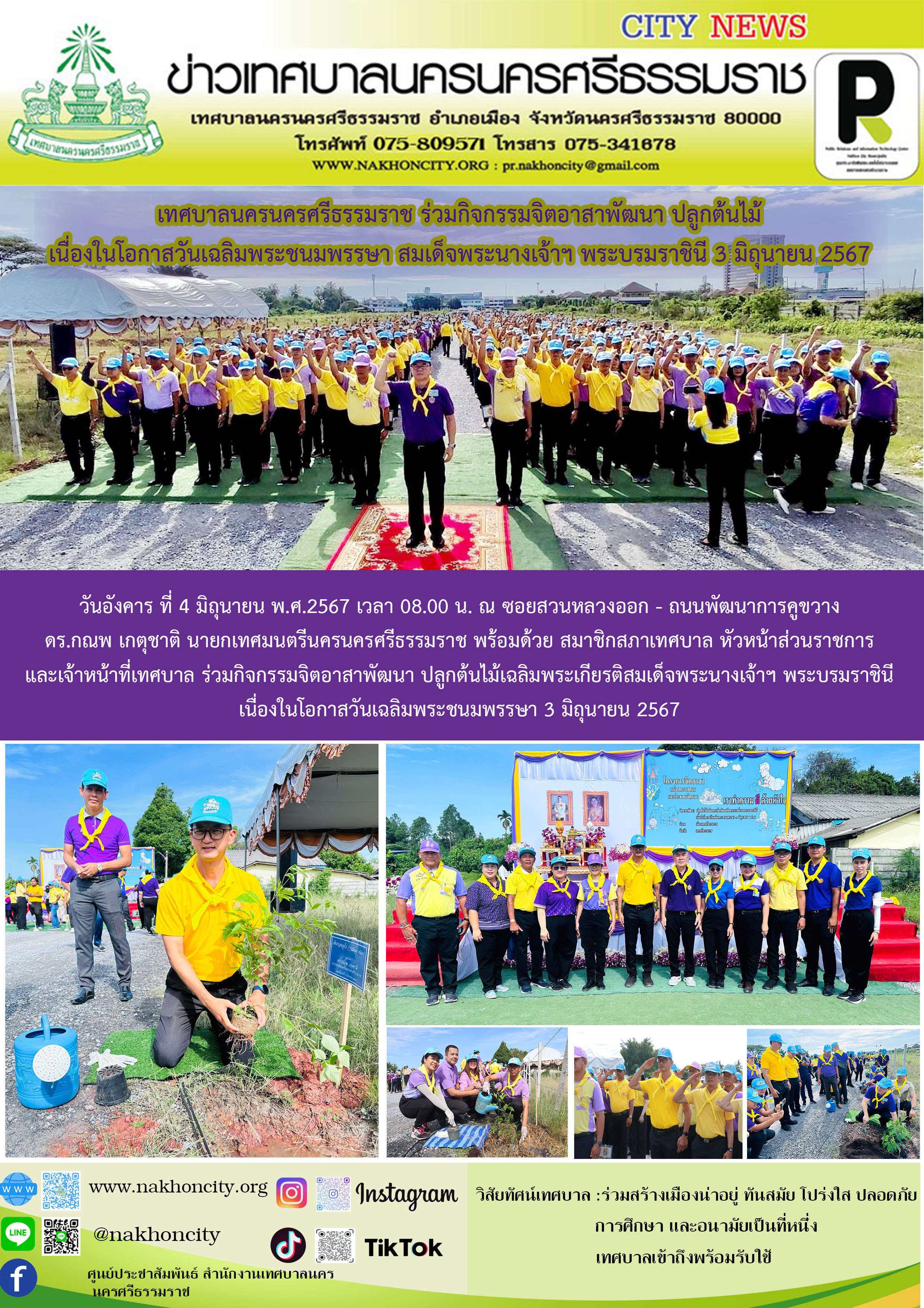 เทศบาลนครนครศรีธรรมราช ร่วมกิจกรรมจิตอาสาพัฒนา ปลูกต้นไม้ เนื่องในโอกาสวันเฉลิมพระชนมพรรษา สมเด็จพระนางเจ้าฯ พระบรมราชินี 3 มิถุนายน 2567 |