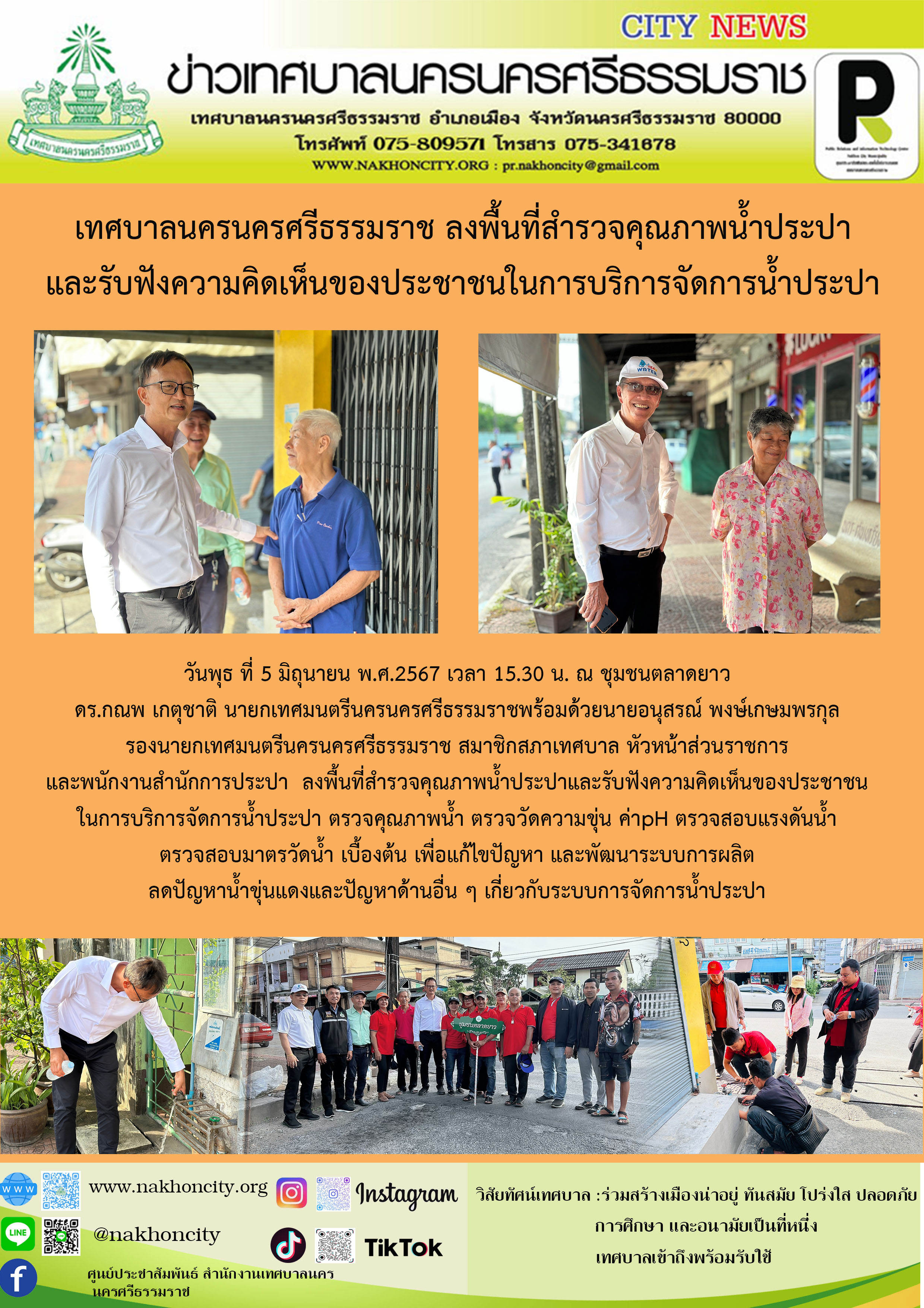 วันพุธ ที่ 5 มิถุนายน พ.ศ.2567 เวลา 15.30 น. ณ ชุมชนตลาดยาว ดร.กณพ เกตุชาติ นายกเทศมนตรีนครนครศรีธรรมราชพร้อมด้วยนายอนุสรณ์ พงษ์เกษมพรกุล รองนายกเทศมนตรีนครนครศรีธรรมราช สมาชิกสภาเทศบาล หัวหน้าส่วนราชการและพนักงานสำนักการประปา ลงพื้นที่สำรวจคุณภาพน้ำประปาและรับฟังความคิดเห็นของประชาชนในการบริการจัดการน้ำประปา ตรวจคุณภาพน้ำ ตรวจวัดความขุ่น ค่าpH ตรวจสอบแรงดันน้ำ ตรวจสอบมาตรวัดน้ำ เบื้องต้น เพื่อแก้ไขปัญหา และพัฒนาระบบการผลิต ลดปัญหาน้ำขุ่นแดงและปัญหาด้านอื่น ๆ เกี่ยวกับระบบการจัดการน้ำประปา