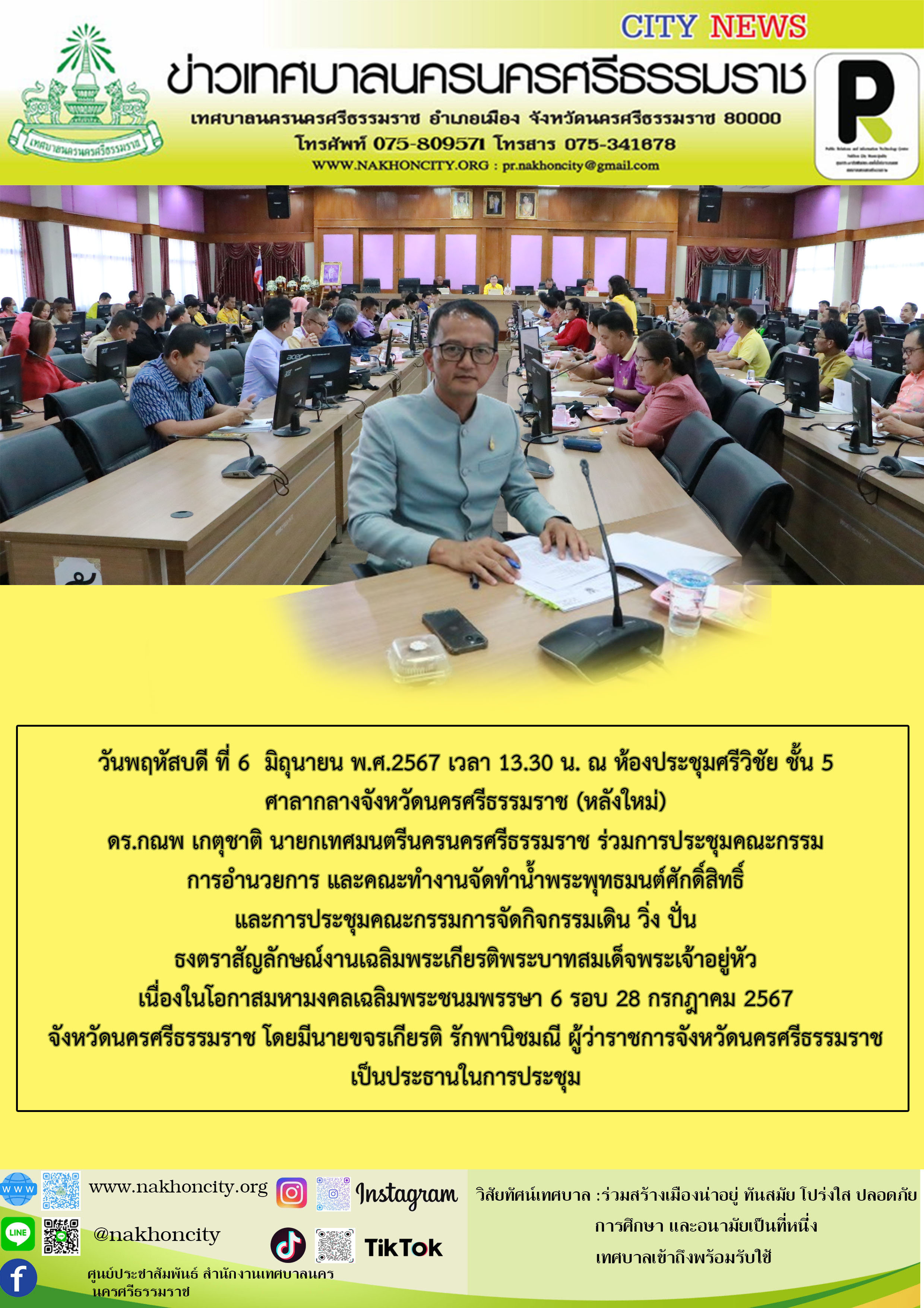 นายกเทศมนตรีนครนครศรีธรรมราช ร่วมการประชุมคณะกรรมการอำนวยการและคณะทำงานจัดทำน้ำพระพุทธมนต์ศักดิ์สิทธิ์ และการประชุมคณะกรรมการจัดกิจกรรมเดิน วิ่ง ปั่น ธงตราสัญลักษณ์งานเฉลิมพระเกียรติพระบาทสมเด็จพระเจ้าอยู่หัวเนื่องในโอกาสมหามงคลเฉลิมพระชนมพรรษา 6 รอบ 28 กรกฎาคม 2567 |