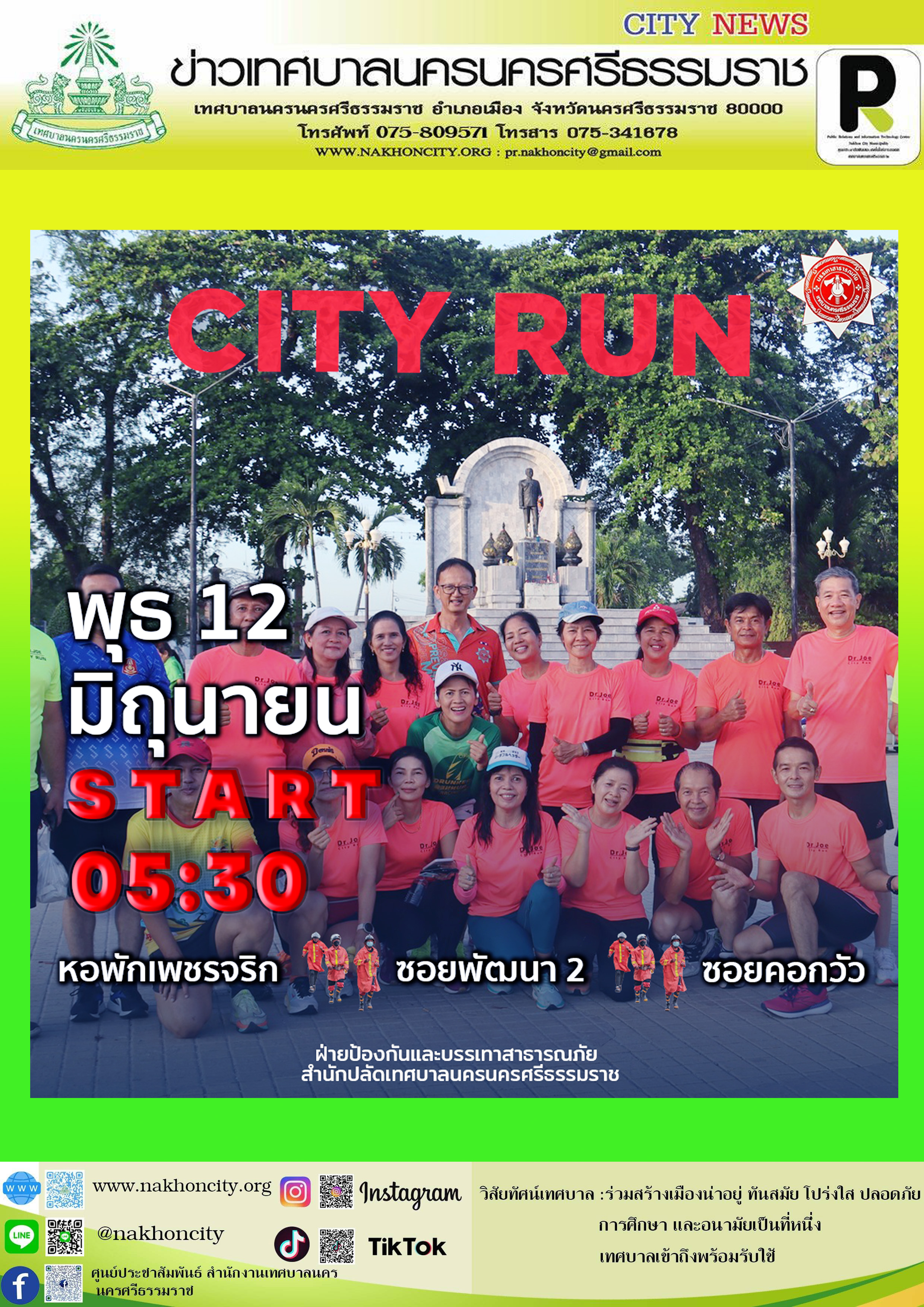 เทศบาลนครนครศรีธรรมราช ขอเชิญประชาชนร่วมกิจกรรม วิ่ง “City Run วันพุธ” วันพุธที่ 12 มิถุนายน พ.ศ.2567 เวลา 05.30 น. ณ จุดนัดพบ อาคารสอนเสริม โรงเรียนสาธิตเทศบาลวัดเพชรจริก |