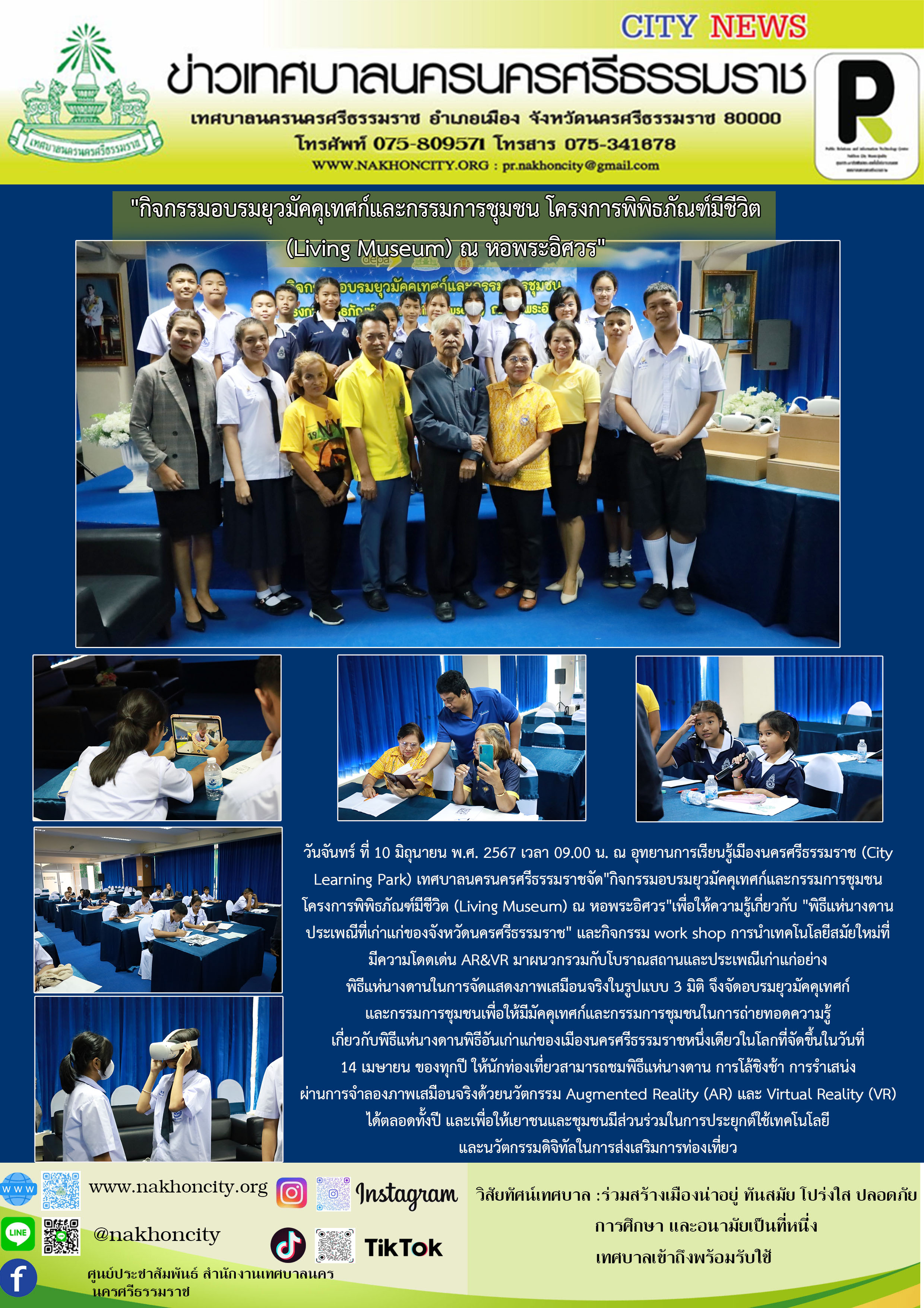 วันจันทร์ ที่ 10 มิถุนายน พ.ศ. 2567 เวลา 09.00 น. ณ อุทยานการเรียนรู้เมืองนครศรีธรรมราช (City Learning Park) เทศบาลนครนครศรีธรรมราชจัด"กิจกรรมอบรมยุวมัคคุเทศก์และกรรมการชุมชน โครงการพิพิธภัณฑ์มีชีวิต (Living Museum) ณ หอพระอิศวร"เพื่อให้ความรู้เกี่ยวกับ "พิธีแห่นางดาน ประเพณีที่เก่าแก่ของจังหวัดนครศรีธรรมราช" และกิจกรรม work shop การนำเทคโนโลยีสมัยใหม่ที่ มีความโดดเด่น AR&VR มาผนวกรวมกับโบราณสถานและประเพณีเก่าแก่อย่างพิธีแห่นางดานในการจัดแสดงภาพเสมือนจริงในรูปแบบ 3 มิติ จึงจัดอบรมยุวมัคคุเทศก์และกรรมการชุมชนเพื่อให้มีมัคคุเทศก์และกรรมการชุมชนในการถ่ายทอดความรู้ เกี่ยวกับพิธีแห่นางดานพิธีอันเก่าแก่ของเมืองนครศรีธรรมราชหนึ่งเดียวในโลกที่จัดขึ้นในวันที่ 14 เมษายน ของทุกปี ให้นักท่องเที่ยวสามารถชมพิธีแห่นางดาน การโล้ชิงช้า การรำเสน่ง ผ่านการจำลองภาพเสมือนจริงด้วยนวัตกรรม Augmented Reality (AR) และ Virtual Reality (VR) ได้ตลอดทั้งปี และเพื่อให้เยาชนและชุมชนมีส่วนร่วมในการประยุกต์ใช้เทคโนโลยีและนวัตกรรมดิจิทัลในการส่งเสริมการท่องเที่ยว