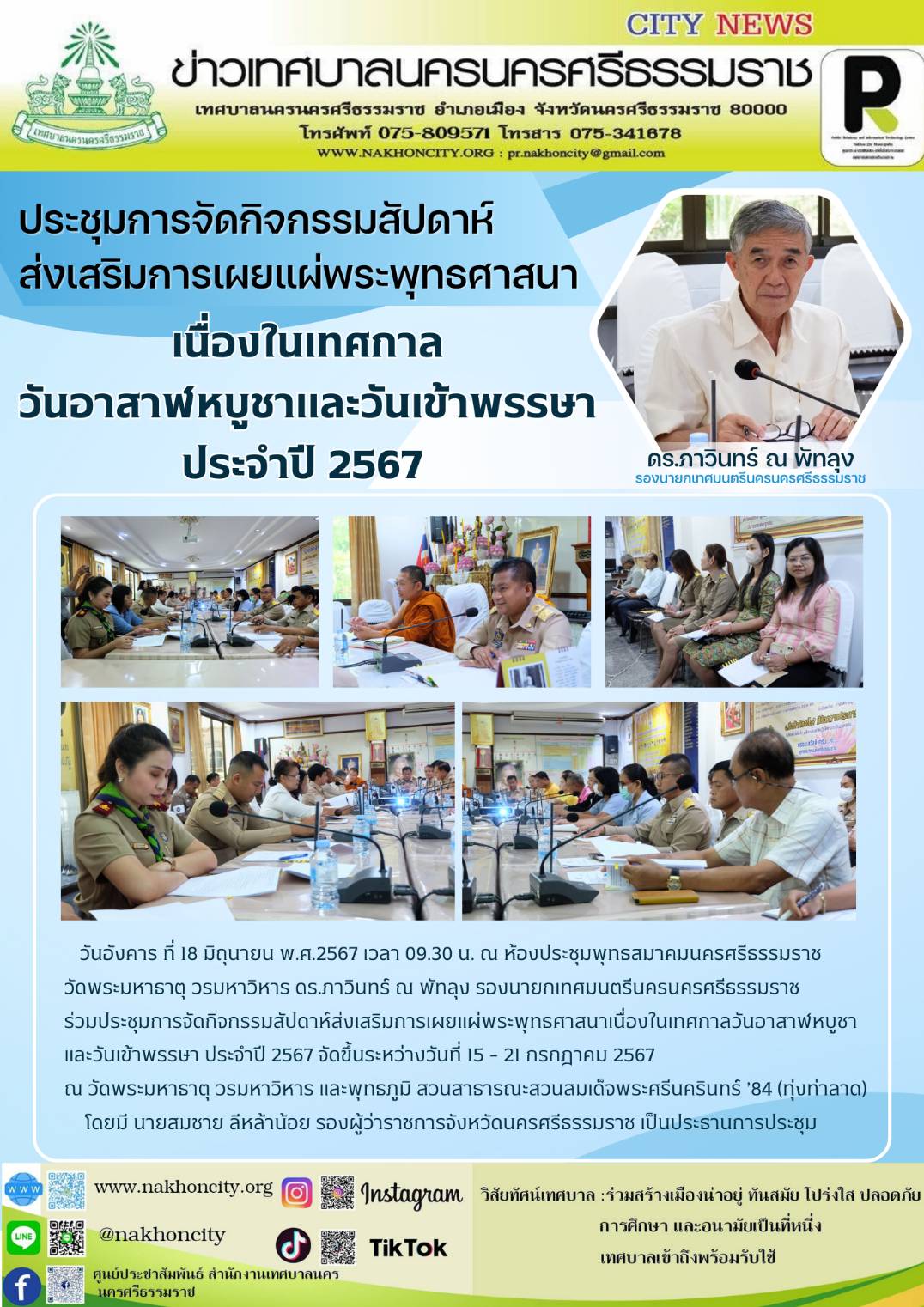 ดร.ภาวินทร์ ณ พัทลุง รองนายกเทศมนตรีนครนครศรีธรรมราช ร่วมประชุมการจัดกิจกรรมสัปดาห์ส่งเสริมการเผยแผ่พระพุทธศาสนา เนื่องในเทศกาลวันอาสาฬหบูชาและวันเข้าพรรษา ประจำปี 2567 |