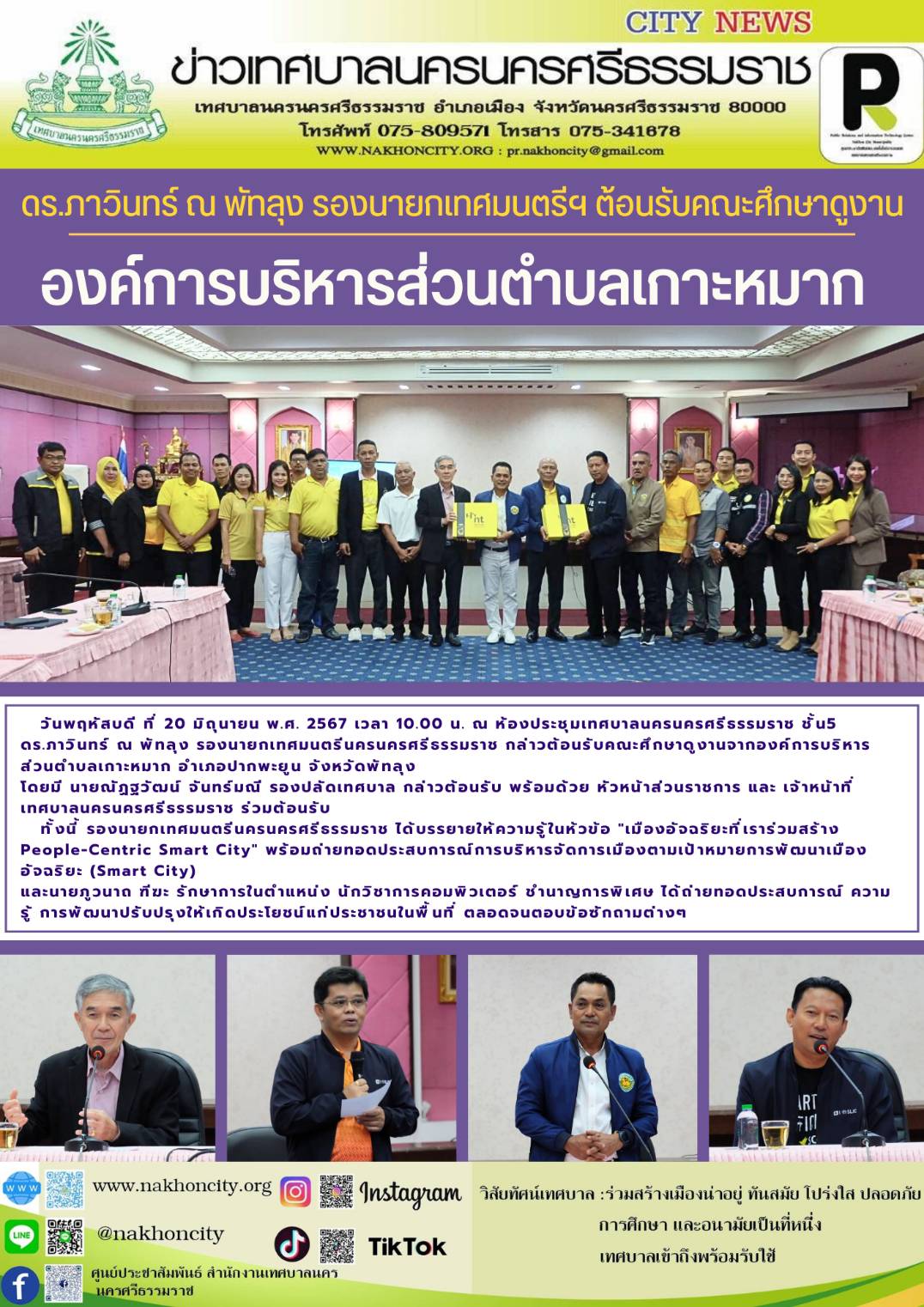 วันพฤหัสบดี ที่ 20 มิถุนายน พ.ศ. 2567 เวลา 10.00 น. ณ ห้องประชุมเทศบาลนครนครศรีธรรมราช ชั้น5 ดร.ภาวินทร์ ณ พัทลุง รองนายกเทศมนตรีนครนครศรีธรรมราช กล่าวต้อนรับคณะศึกษาดูงานจากองค์การบริหารส่วนตำบลเกาะหมาก อำเภอปากพะยูน จังหวัดพัทลุง โดยมี นายณัฏฐวัฒน์ จันทร์มณี รองปลัดเทศบาล กล่าวต้อนรับ พร้อมด้วย หัวหน้าส่วนราชการ และ เจ้าหน้าที่เทศบาลนครนครศรีธรรมราช ร่วมต้อนรับ ทั้งนี้ รองนายกเทศมนตรีนครนครศรีธรรมราช ได้บรรยายให้ความรู้ในห้วข้อ "เมืองอัจฉริยะที่เราร่วมสร้าง People-Centric Smart City" พร้อมถ่ายทอดประสบการณ์การบริหารจัดการเมืองตามเป้าหมายการพัฒนาเมืองอัจฉริยะ (Smart City) และนายภูวนาถ ฑีฆะ รักษาการในตำแหน่ง นักวิชาการคอมพิวเตอร์ ชำนาญการพิเศษ ได้ถ่ายทอดประสบการณ์ ความรู้ การพัฒนาปรับปรุงให้เกิดประโยชน์แก่ประชาชนในพื้นที่ ตลอดจนตอบข้อซักถามต่างๆ ............... ภาพ//จันทร์จิรา//จิรภัทร ข่าว//จันทร์จิรา |