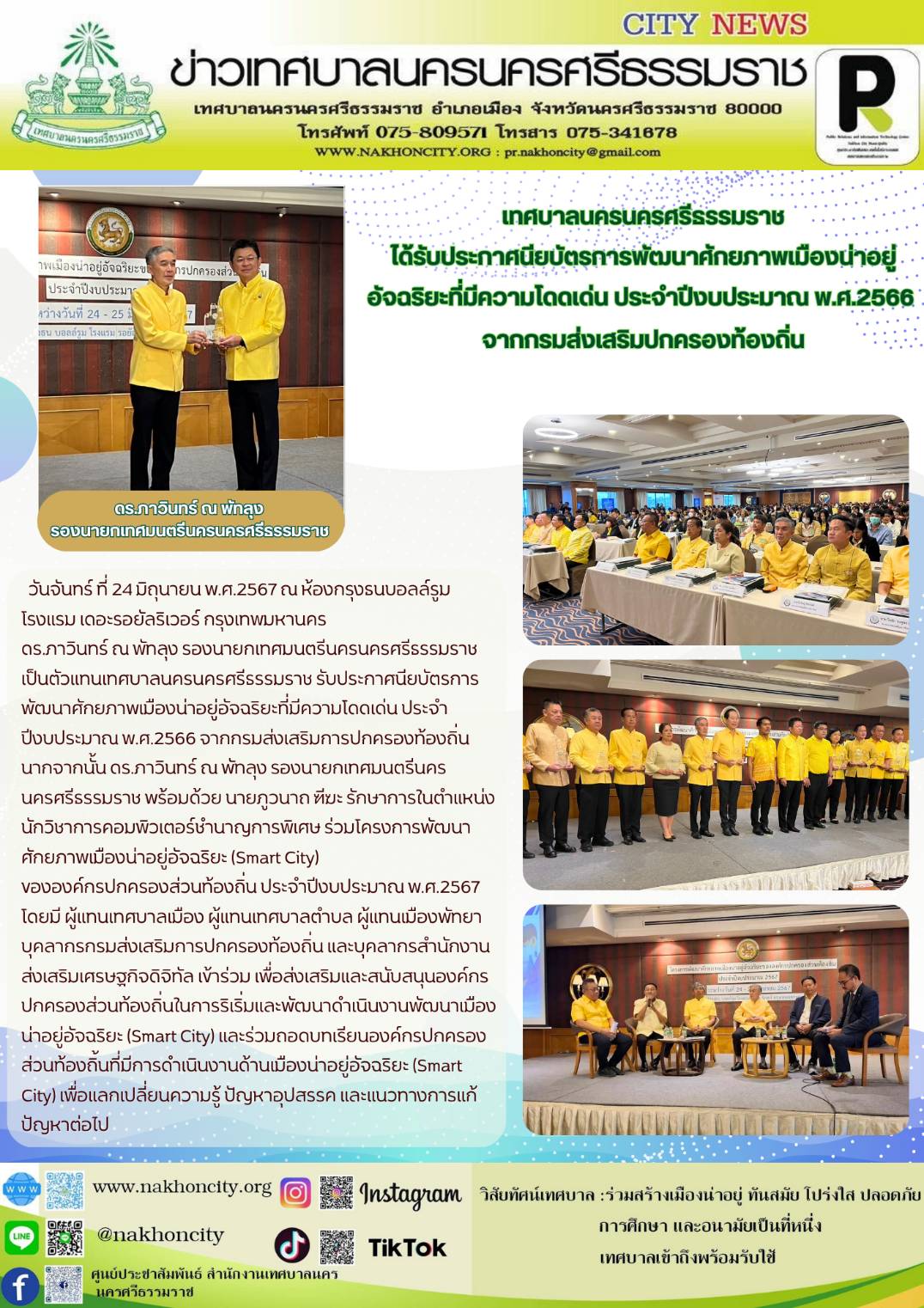 เทศบาลนครนครศรีธรรมราช รับประกาศนียบัตรการพัฒนาศักยภาพเมืองน่าอยู่อัจฉริยะที่มีความโดดเด่น ประจำปีงบประมาณ พ.ศ.2566 จากกรมส่งเสริมการปกครองท้องถิ่น |