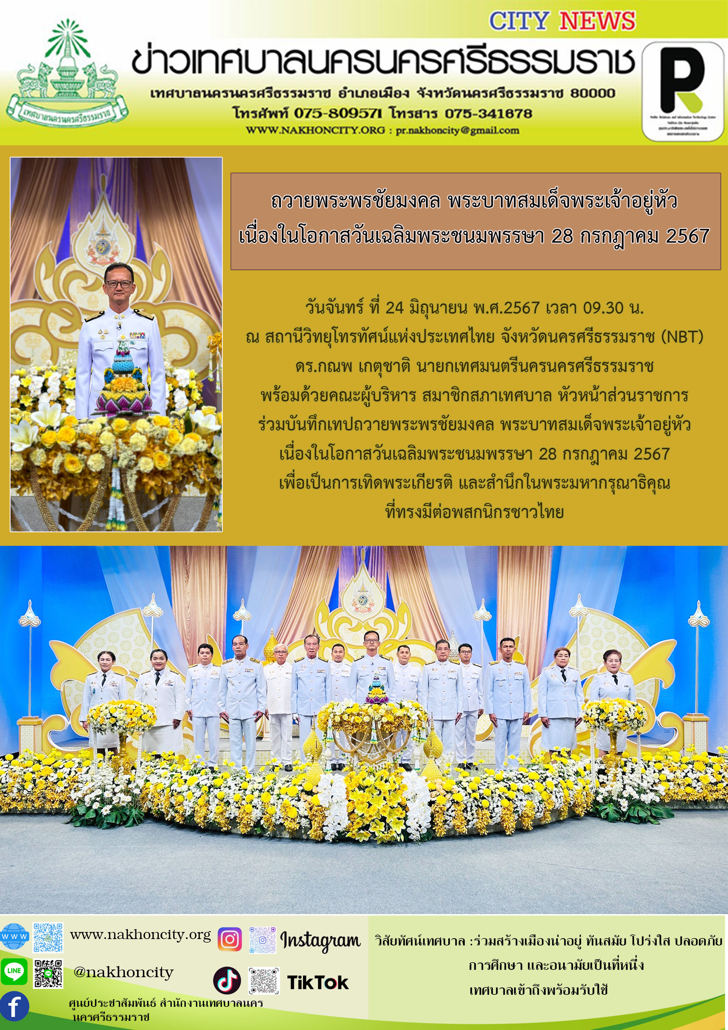 นายกเทศมนตรีนครนครศรีธรรมราช พร้อมด้วยคณะผู้บริหาร สมาชิกสภาเทศบาล หัวหน้าส่วนราชการ ร่วมบันทึกเทปถวายพระพรชัยมงคล พระบาทสมเด็จพระเจ้าอยู่หัว เนื่องในโอกาสวันเฉลิมพระชนมพรรษา 28 กรกฎาคม 2567 |