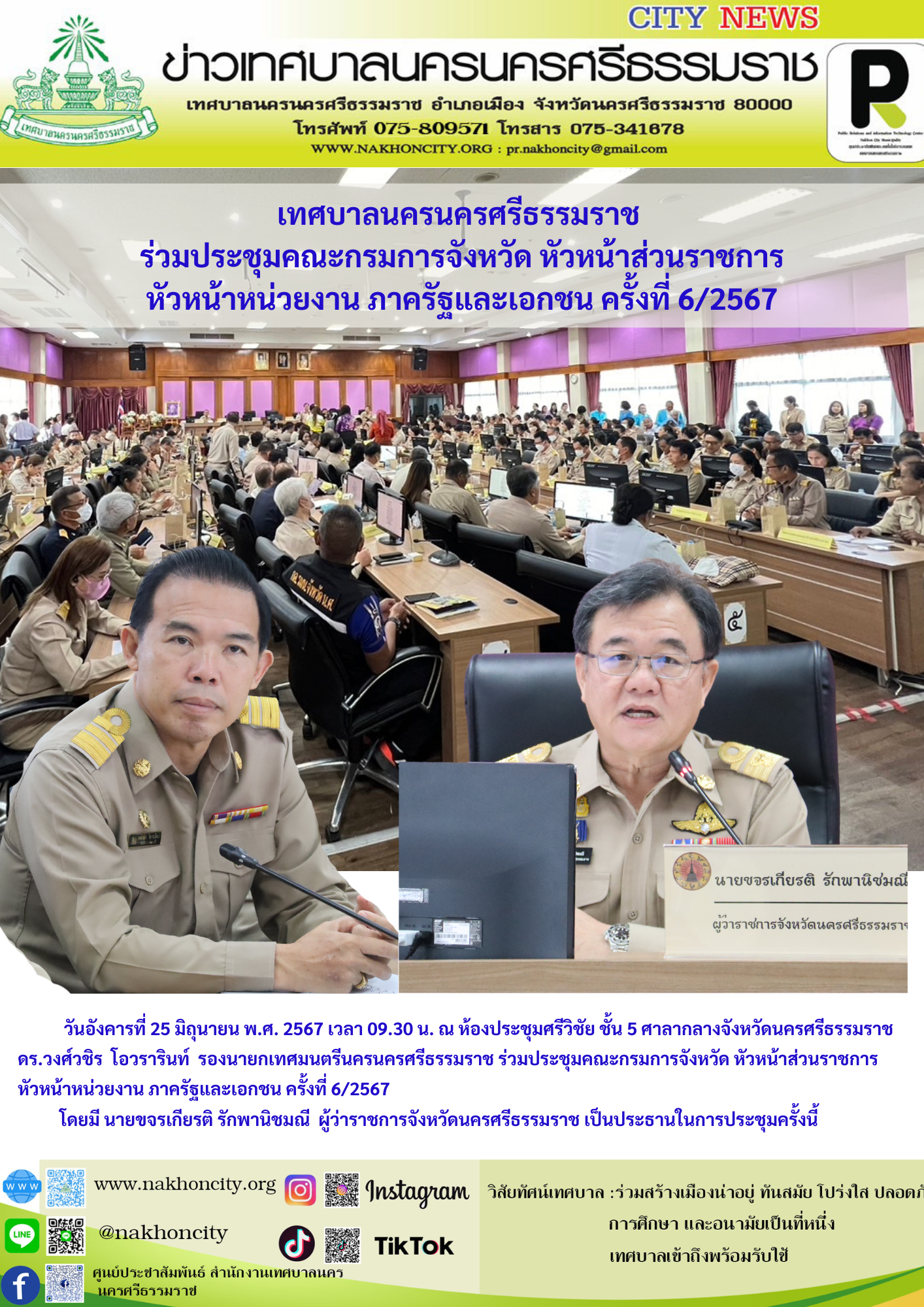 วันอังคารที่ 25 มิถุนายน พ.ศ. 2567 เวลา 09.30 น. ณ ห้องประชุมศรีวิชัย ชั้น 5 ศาลากลางจังหวัดนครศรีธรรมราช ดร.วงศ์วชิร โอวรารินท์ รองนายกเทศมนตรีนครนครศรีธรรมราช ร่วมประชุมคณะกรมการจังหวัด หัวหน้าส่วนราชการ หัวหน้าหน่วยงาน ภาครัฐและเอกชน ครั้งที่ 6/2567 โดยมี นายขจรเกียรติ รักพานิชมณี ผู้ว่าราชการจังหวัดนครศรีธรรมราช เป็นประธานในการประชุมครั้งนี้
