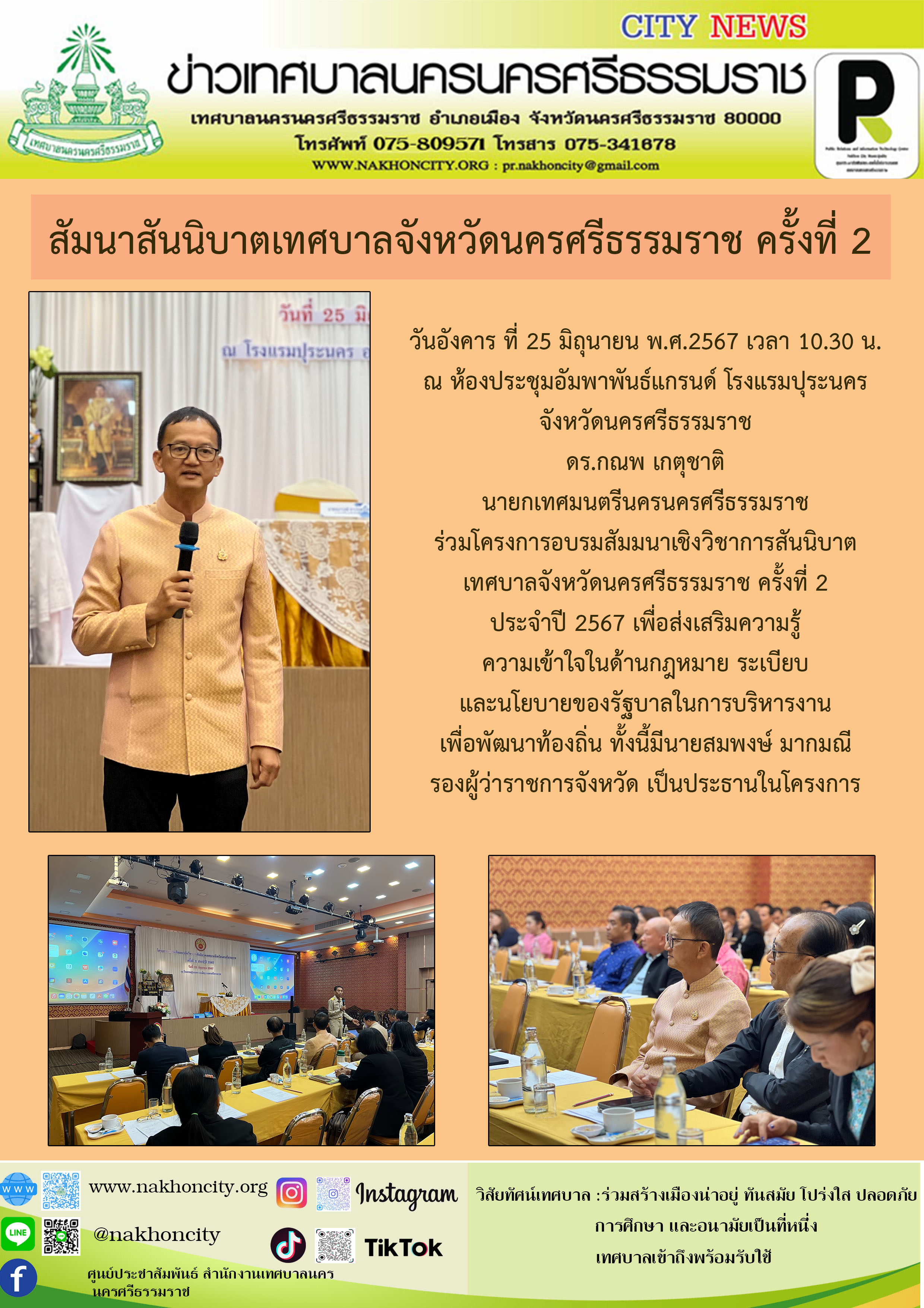 นายกเทศมนตรีนครนครศรีธรรมราชร่วมโครงการอบรมสัมมนาเชิงวิชาการสันนิบาตเทศบาลจังหวัดนครศรีธรรมราช ครั้งที่ 2 ประจำปี 2567 |