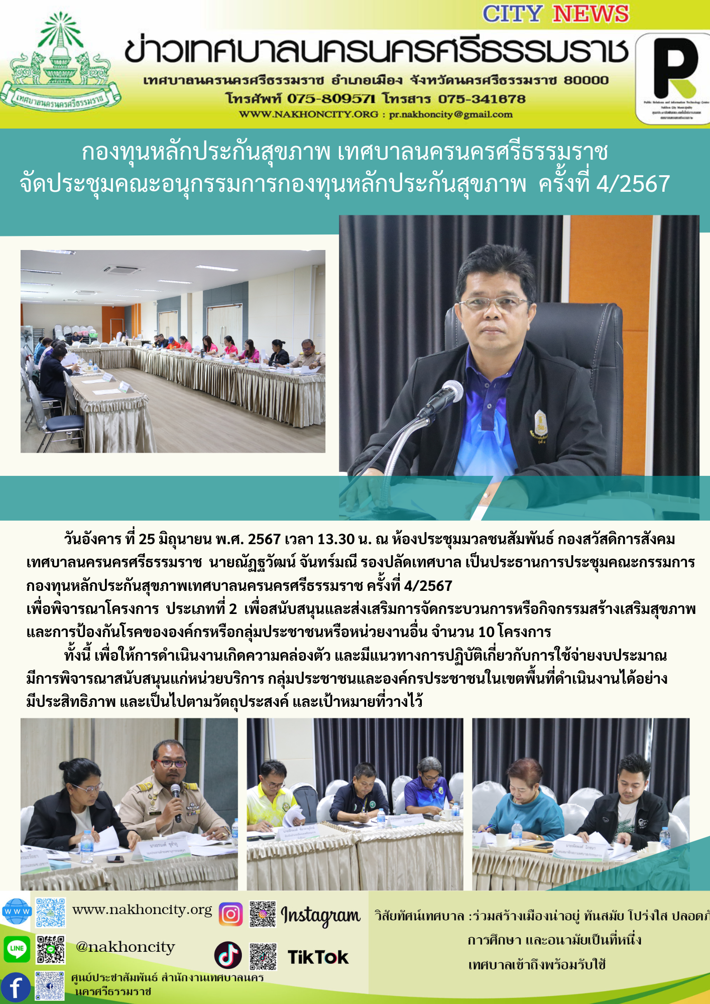 กองทุนหลักประกันสุขภาพ เทศบาลนครนครศรีธรรมราช จัดประชุมคณะอนุกรรมการกองทุนหลักประกันสุขภาพ ครั้งที่ 4/2567 วันอังคาร ที่ 25 มิถุนายน พ.ศ. 2567 เวลา 13.30 น. ณ ห้องประชุมมวลชนสัมพันธ์ กองสวัสดิการสังคม เทศบาลนครนครศรีธรรมราช นายณัฏฐวัฒน์ จันทร์มณี รองปลัดเทศบาล เป็นประธานการประชุมคณะกรรมการกองทุนหลักประกันสุขภาพเทศบาลนครนครศรีธรรมราช ครั้งที่ 4/2567 เพื่อพิจารณาโครงการ ประเภทที่ 2 เพื่อสนับสนุนและส่งเสริมการจัดกระบวนการหรือกิจกรรมสร้างเสริมสุขภาพ และการป้องกันโรคขององค์กรหรือกลุ่มประชาชนหรือหน่วยงานอื่น จำนวน 10 โครงการ ทั้งนี้ เพื่อให้การดำเนินงานเกิดความคล่องตัว และมีแนวทางการปฏิบัติเกี่ยวกับการใช้จ่ายงบประมาณ มีการพิจารณาสนับสนุนแก่หน่วยบริการ กลุ่มประชาชนและองค์กรประชาชนในเขตพื้นที่ดำเนินงานได้อย่างมีประสิทธิภาพ และเป็นไปตามวัตถุประสงค์ และเป้าหมายที่วางไว้ |