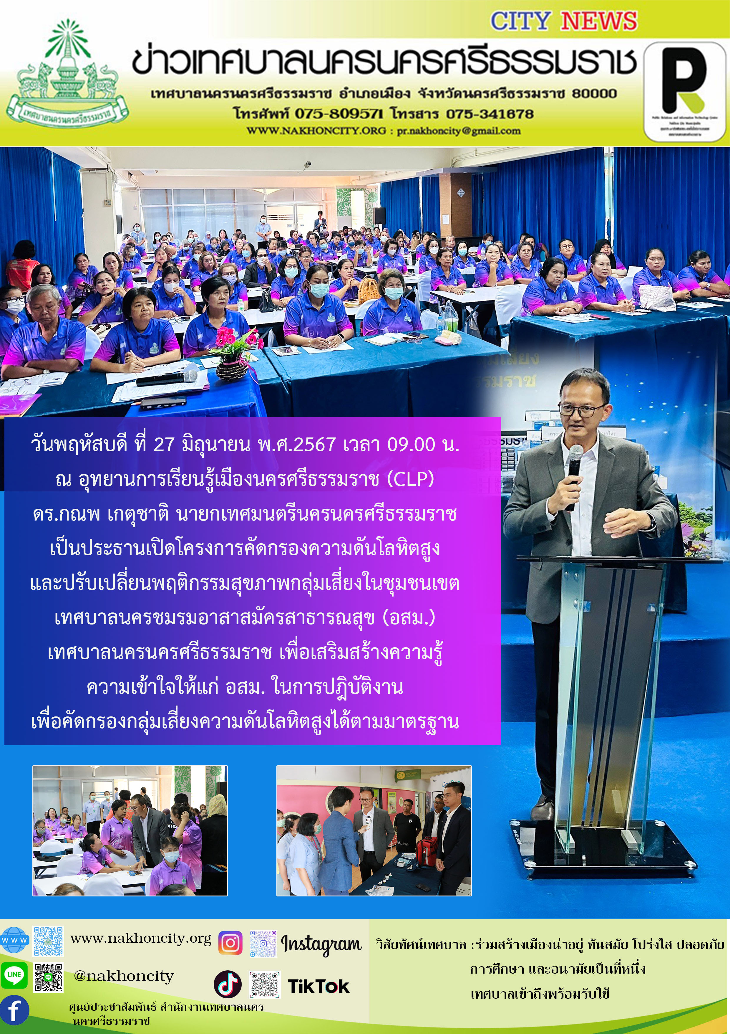 นายกเทศมนตรีนครนครศรีธรรมราช เป็นประธานเปิดโครงการคัดกรองความดันโลหิตสูงและปรับเปลี่ยนพฤติกรรมสุขภาพกลุ่มเสี่ยงในชุมชนเขตเทศบาลนครชมรมอาสาสมัครสาธารณสุข (อสม.) เทศบาลนครนครศรีธรรมราช |