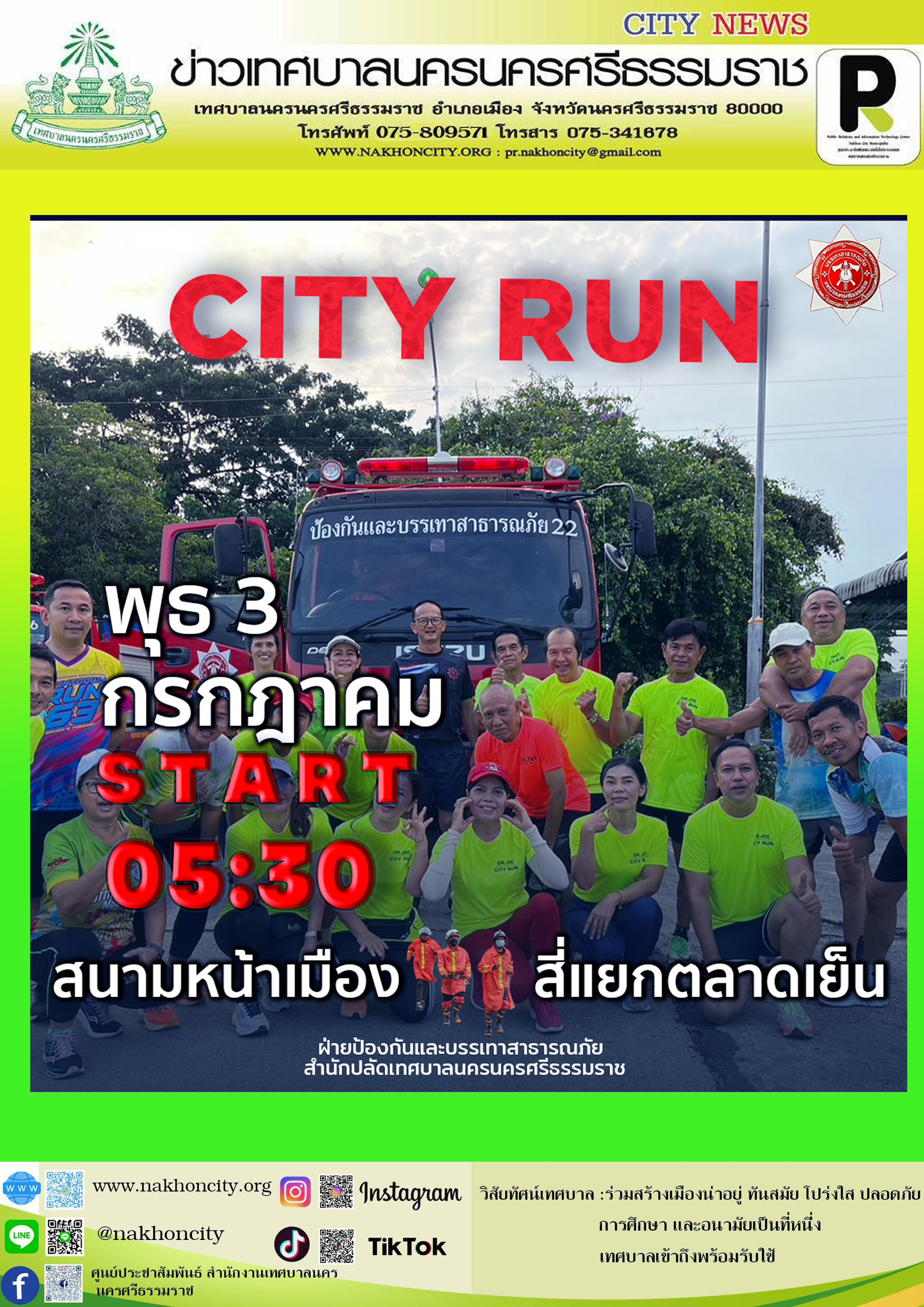 วิ่ง “City Run วันพุธ” วันพุธที่ 3 กรกฎาคม พ.ศ.2567 เวลา 05.30 น. ณ จุดนัดพบ สนามหน้าเมือง |