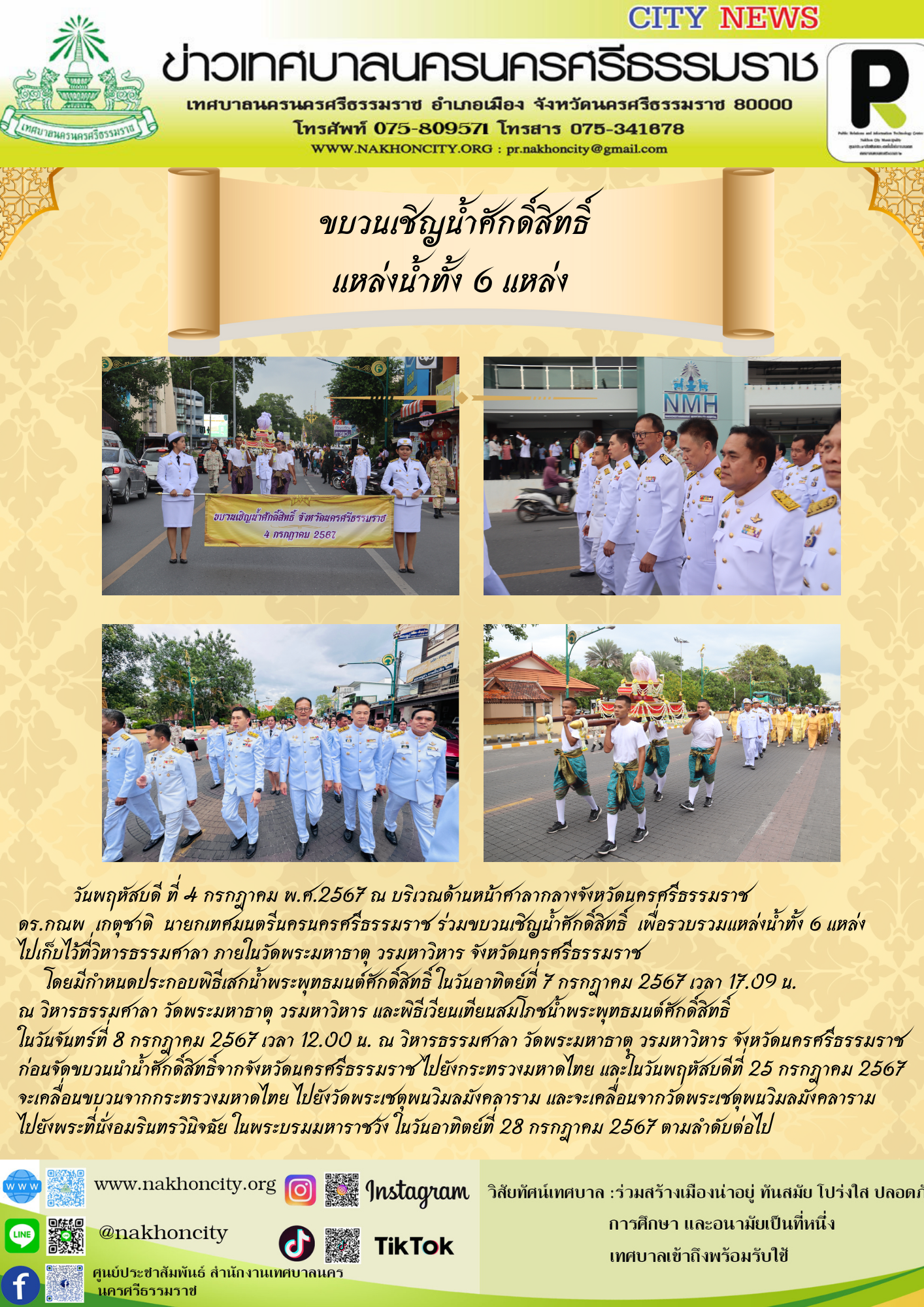 วันพฤหัสบดี ที่ 4 กรกฎาคม พ.ศ.2567 ณ บริเวณด้านหน้าศาลากลางจังหวัดนครศรีธรรมราช ดร.กณพ เกตุชาติ นายกเทศมนตรีนครนครศรีธรรมราช ร่วมขบวนเชิญน้ำศักดิ์สิทธิ์ เพื่อรวบรวมแหล่งน้ำทั้ง 6 แหล่ง ไปเก็บไว้ที่วิหารธรรมศาลา ภายในวัดพระมหาธาตุ วรมหาวิหาร จังหวัดนครศรีธรรมราช โดยมีกำหนดประกอบพิธีเสกน้ำพระพุทธมนต์ศักดิ์สิทธิ์ ในวันอาทิตย์ที่ 7 กรกฎาคม 2567 เวลา 17.09 น. ณ วิหารธรรมศาลา วัดพระมหาธาตุ วรมหาวิหาร และพิธีเวียนเทียนสมโภชน้ำพระพุทธมนต์ศักดิ์สิทธิ์ ในวันจันทร์ที่ 8 กรกฎาคม 2567 เวลา 12.00 น. ณ วิหารธรรมศาลา วัดพระมหาธาตุ วรมหาวิหาร จังหวัดนครศรีธรรมราช ก่อนจัดขบวนนำน้ำศักดิ์สิทธิ์จากจังหวัดนครศรีธรรมราช ไปยังกระทรวงมหาดไทย และในวันพฤหัสบดีที่ 25 กรกฎาคม 2567 จะเคลื่อนขบวนจากกระทรวงมหาดไทย ไปยังวัดพระเชตุพนวิมลมังคลาราม และจะเคลื่อนจากวัดพระเชตุพนวิมลมังคลาราม ไปยังพระที่นั่งอมรินทรวินิจฉัย ในพระบรมมหาราชวัง ในวันอาทิตย์ที่ 28 กรกฎาคม 2567 ตามลำดับต่อไป |
