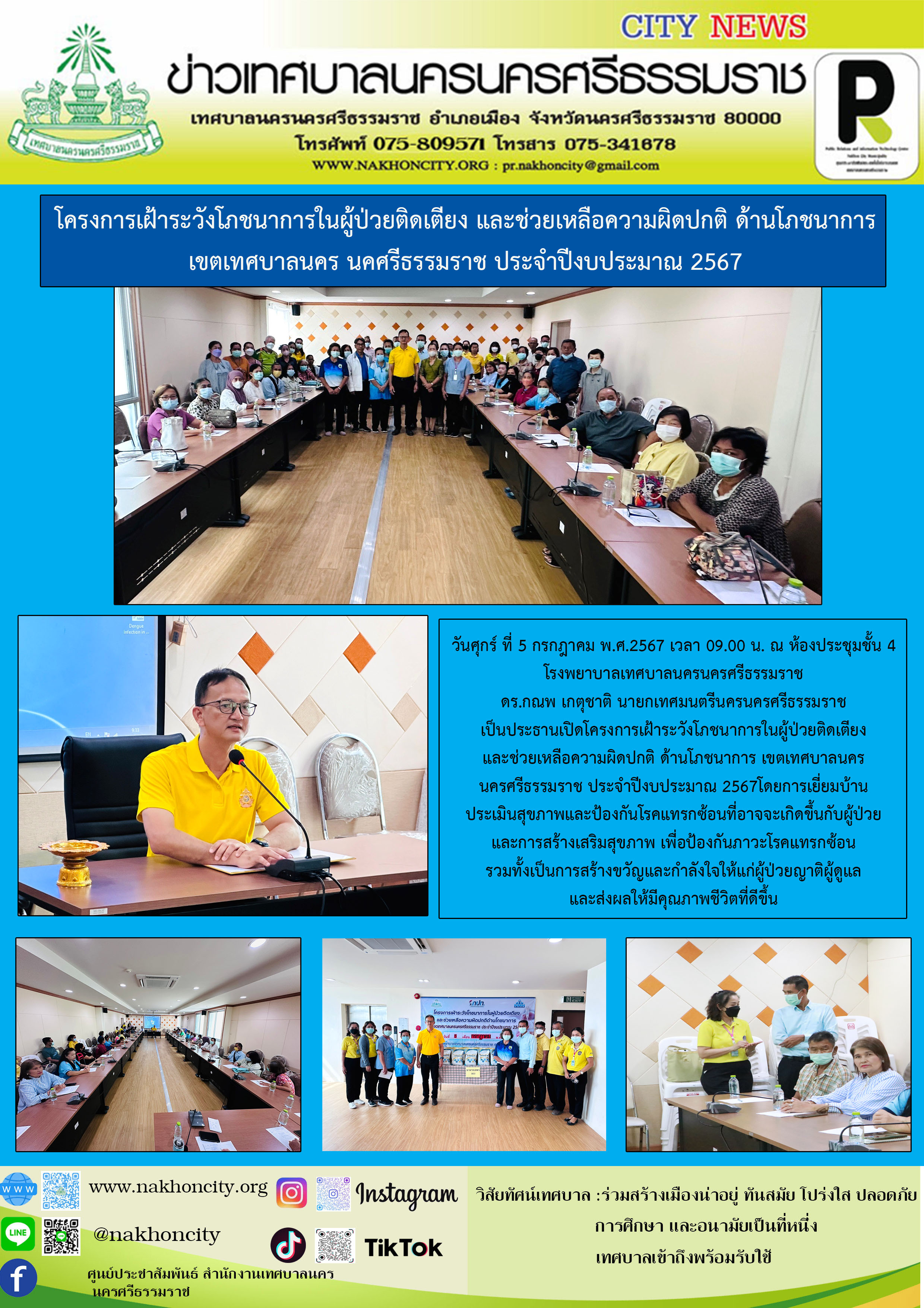 นายกเทศมนตรีนครนครศรีธรรมราชเป็นประธานเปิดโครงการเฝ้าระวังโภชนาการในผู้ป่วยติดเตียง และช่วยเหลือความผิดปกติ ด้านโภชนาการ เขตเทศบาลนครนคศรีธรรมราช ประจำปีงบประมาณ 2567 |