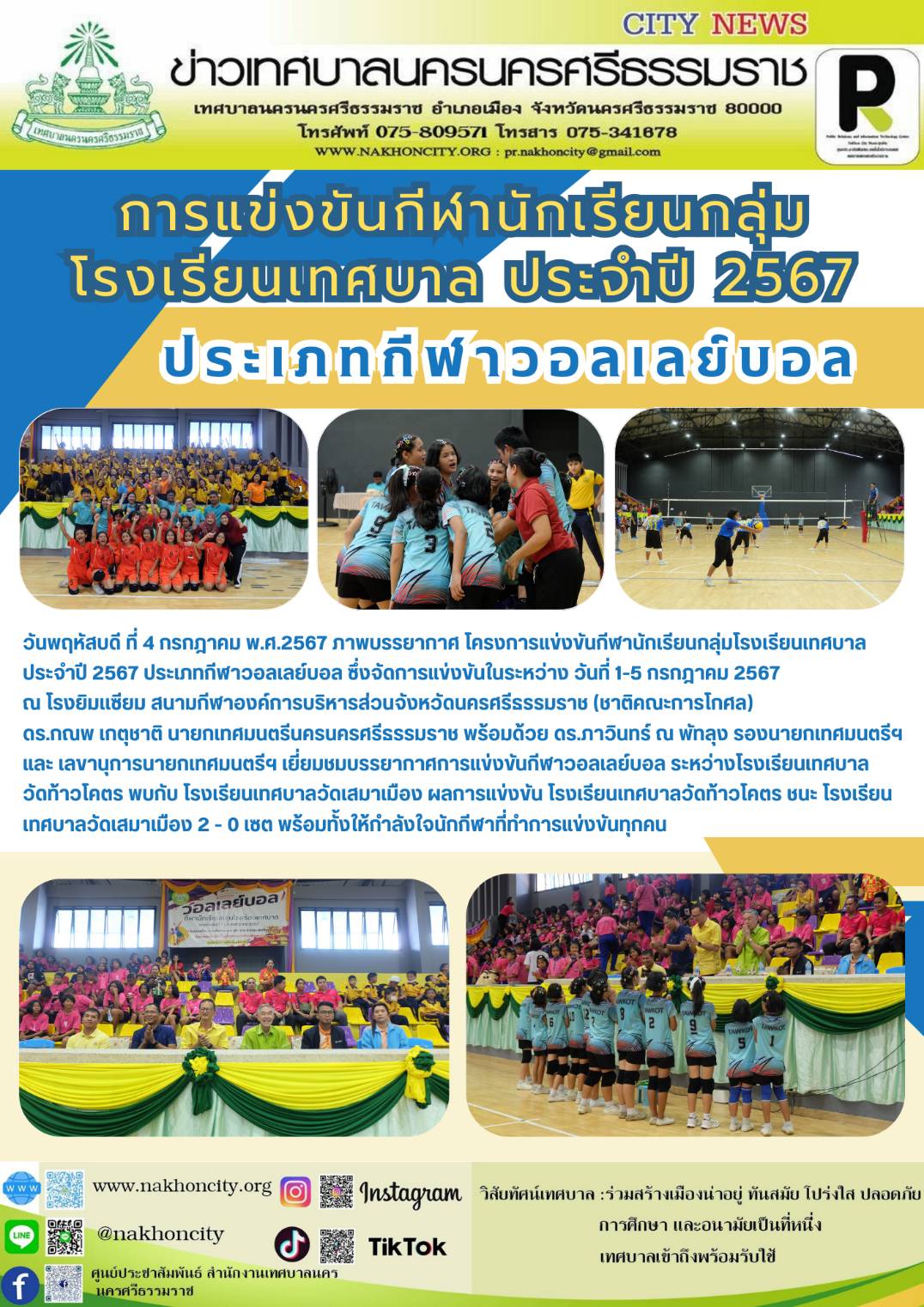 ภาพบรรยากาศ โครงการแข่งขันกีฬานักเรียนกลุ่มโรงเรียนเทศบาล ประจำปี 2567 ประเภทกีฬาวอลเลย์บอล ซึ่งจัดการแข่งขันในระหว่าง วันที่ 1-5 กรกฎาคม 2567 ณ โรงยิมเเซียม สนามกีฬาองค์การบริหารส่วนจังหวัดนครศรีธรรมราช (ชาติคณะการโกศล) |