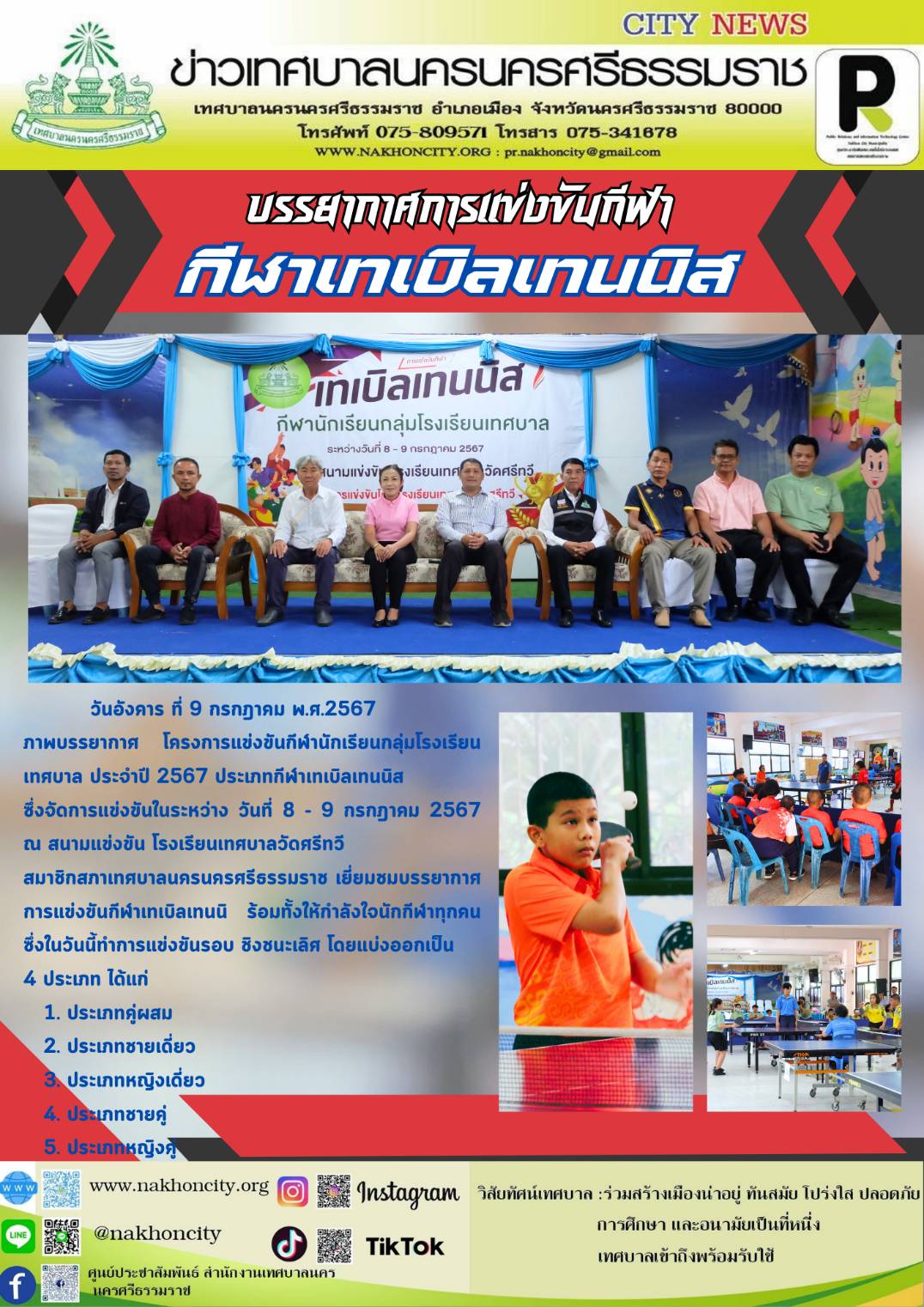 วันอังคาร ที่ 9 กรกฎาคม พ.ศ.2567 ภาพบรรยากาศ โครงการแข่งขันกีฬานักเรียนกลุ่มโรงเรียนเทศบาล ประจำปี 2567 ประเภทกีฬาเทเบิลเทนนิส ซึ่งจัดการแข่งขันในระหว่าง วันที่ 8 - 9 กรกฎาคม 2567 ณ สนามแข่งขัน โรงเรียนเทศบาลวัดศรีทวี สมาชิกสภาเทศบาลนครนครศรีธรรมราช เยี่ยมชมบรรยากาศการแข่งขันกีฬาเทเบิลเทนนิส พร้อมทั้งให้กำลังใจนักกีฬาทุกคน ซึ่งในวันนี้ทำการแข่งขันรอบชิงชนะเลิศ โดยแบ่งออกเป็น 4 ประเภท ได้แก่ 1. ประเภทคู่ผสม 2. ประเภทชายเดี่ยว 3. ประเภทหญิงเดี่ยว 4. ประเภทชายคู่ 5. ประเภทหญิงคู่ .............. ภาพ//ข่าว//จันทร์จิรา |