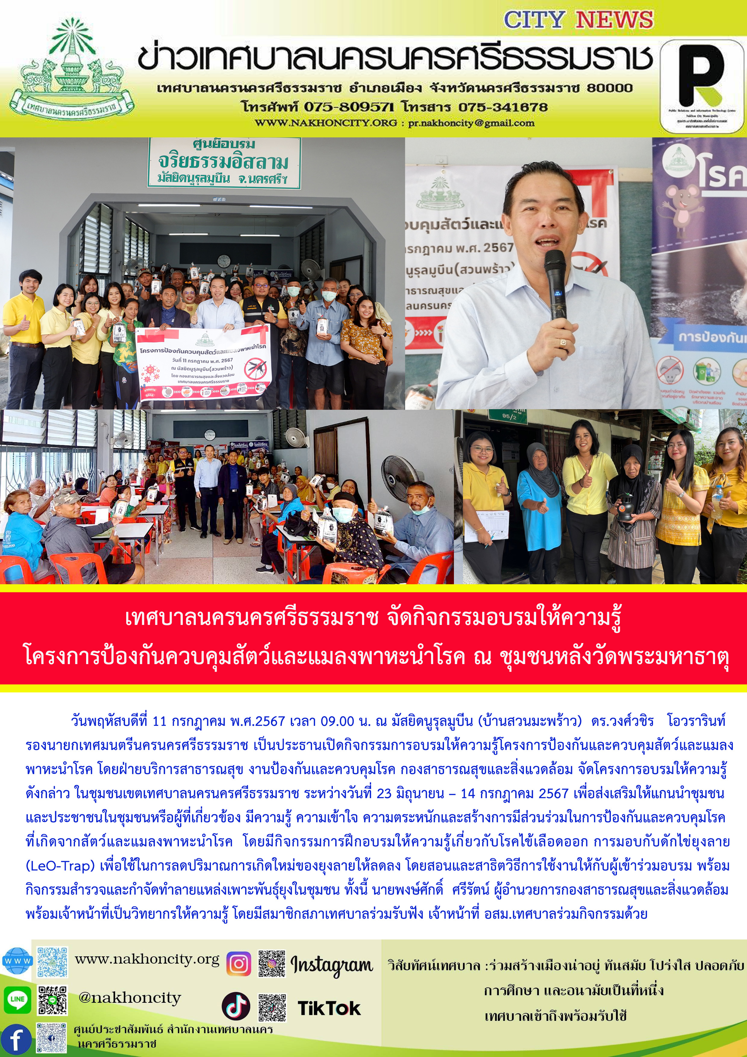 เทศบาลนครนครศรีธรรมราช จัดกิจกรรมอบรมให้ความรู้ โครงการป้องกันควบคุมสัตว์และแมลงพาหะนำโรค ณ ชุมชนหลังวัดพระมหาธาตุ วันพฤหัสบดีที่ 11กรกฎาคม พ.ศ.2567 เวลา 09.00 น. ณ มัสยิดนูรุลมูบีน (บ้านสวนมะพร้าว) ดร.วงศ์วชิร โอวรารินท์ รองนายกเทศมนตรีนครนครศรีธรรมราช เป็นประธานเปิดกิจกรรมการอบรมให้ความรู้โครงการป้องกันและควบคุมสัตว์และแมลงพาหะนำโรค โดยฝ่ายบริการสาธารณสุข งานป้องกันเเละควบคุมโรค กองสาธารณสุขและสิ่งแวดล้อม จัดโครงการอบรมให้ความรู้ดังกล่าว ในชุมชนเขตเทศบาลนครนครศรีธรรมราช ระหว่างวันที่ 23 มิถุนายน – 14 กรกฎาคม 2567 เพื่อส่งเสริมให้แกนนำชุมชนและประชาชนในชุมชนหรือผู้ที่เกี่ยวข้อง มีความรู้ ความเข้าใจ ความตระหนักและสร้างการมีส่วนร่วมในการป้องกันและควบคุมโรคที่เกิดจากสัตว์และแมลงพาหะนำโรค โดยมีกิจกรรมการฝึกอบรมให้ความรู้เกี่ยวกับโรคไข้เลือดออก การมอบกับดักไข่ยุงลาย (LeO-Trap) เพื่อใช้ในการลดปริมาณการเกิดใหม่ของยุงลายให้ลดลง โดยสอนและสาธิตวิธีการใช้งานให้กับผู้เข้าร่วมอบรม พร้อมกิจกรรมสำรวจและกำจัดทำลายแหล่งเพาะพันธุ์ยุงในชุมชน ทั้งนี้ นายพงษ์ศักดิ์ ศรีรัตน์ ผู้อำนวยการกองสาธารณสุขและสิ่งแวดล้อม พร้อมเจ้าหน้าที่เป็นวิทยากรให้ความรู้ โดยมีสมาชิกสภาเทศบาลร่วมรับฟัง เจ้าหน้าที่ อสม.เทศบาลร่วมกิจกรรมด้วย |