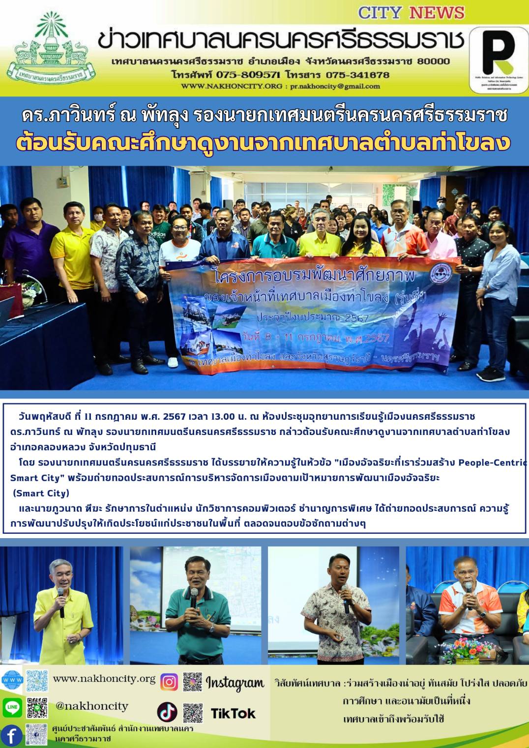 วันพฤหัสบดี ที่ 11 กรกฎาคม พ.ศ. 2567 เวลา 13.00 น. ณ ห้องประชุมอุทยานการเรียนรู้เมืองนครศรีธรรมราช ดร.ภาวินทร์ ณ พัทลุง รองนายกเทศมนตรีนครนครศรีธรรมราช กล่าวต้อนรับคณะศึกษาดูงานจากเทศบาลตำบลท่าโขลง อำเภอคลองหลวง จังหวัดปทุมธานี โดย รองนายกเทศมนตรีนครนครศรีธรรมราช ได้บรรยายให้ความรู้ในห้วข้อ "เมืองอัจฉริยะที่เราร่วมสร้าง People-Centric Smart City" พร้อมถ่ายทอดประสบการณ์การบริหารจัดการเมืองตามเป้าหมายการพัฒนาเมืองอัจฉริยะ (Smart City) และนายภูวนาถ ฑีฆะ รักษาการในตำแหน่ง นักวิชาการคอมพิวเตอร์ ชำนาญการพิเศษ ได้ถ่ายทอดประสบการณ์ ความรู้ การพัฒนาปรับปรุงให้เกิดประโยชน์แก่ประชาชนในพื้นที่ ตลอดจนตอบข้อซักถามต่างๆ ............... ภาพ//ข่าว//จันทร์จิรา |