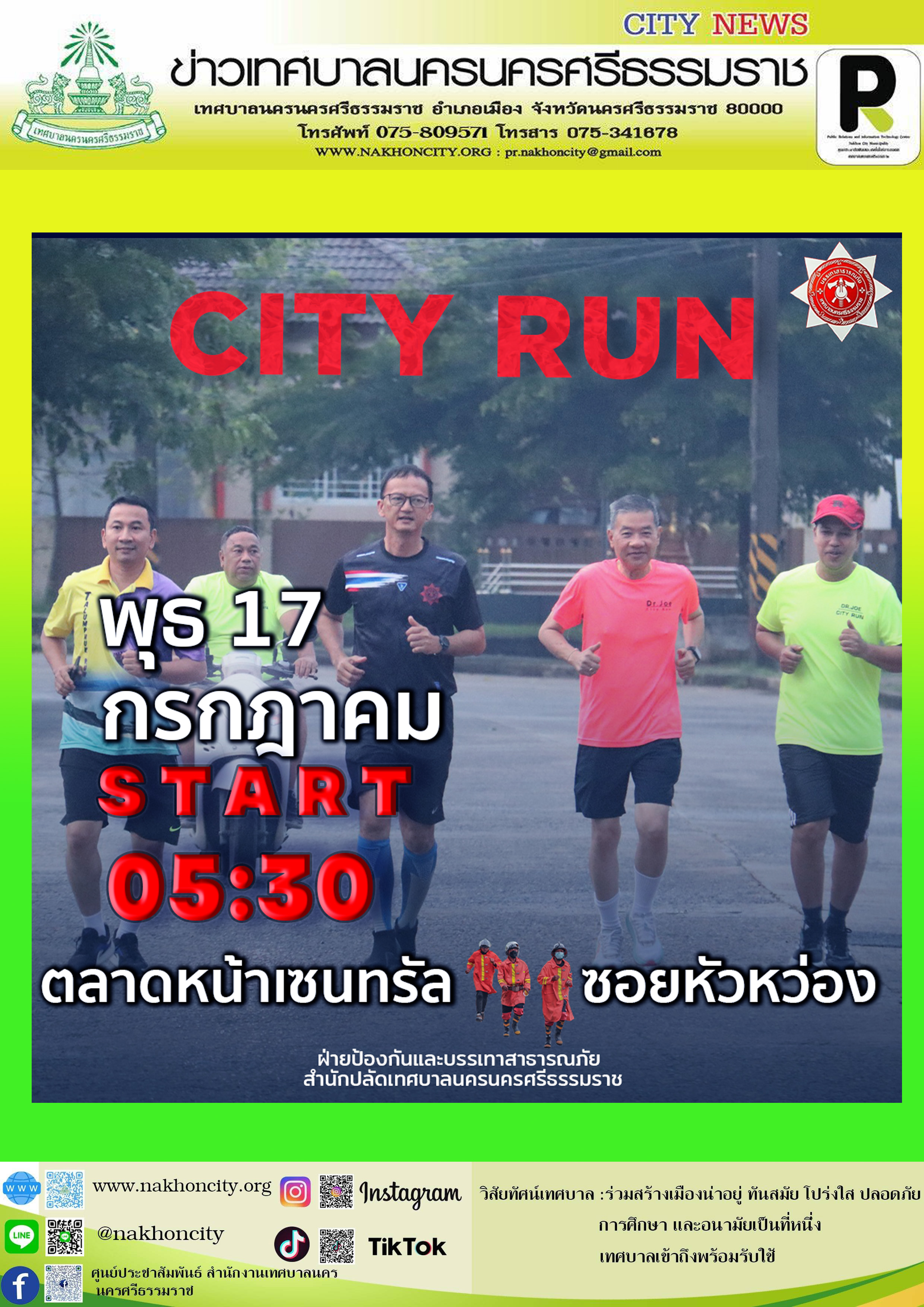 วิ่ง “City Run วันพุธ” วันพุธที่ 17 กรกฎาคม พ.ศ.2567 เวลา 05.30 น. ณ จุดนัดพบ ตลาดหน้าเซ็นทรัล |