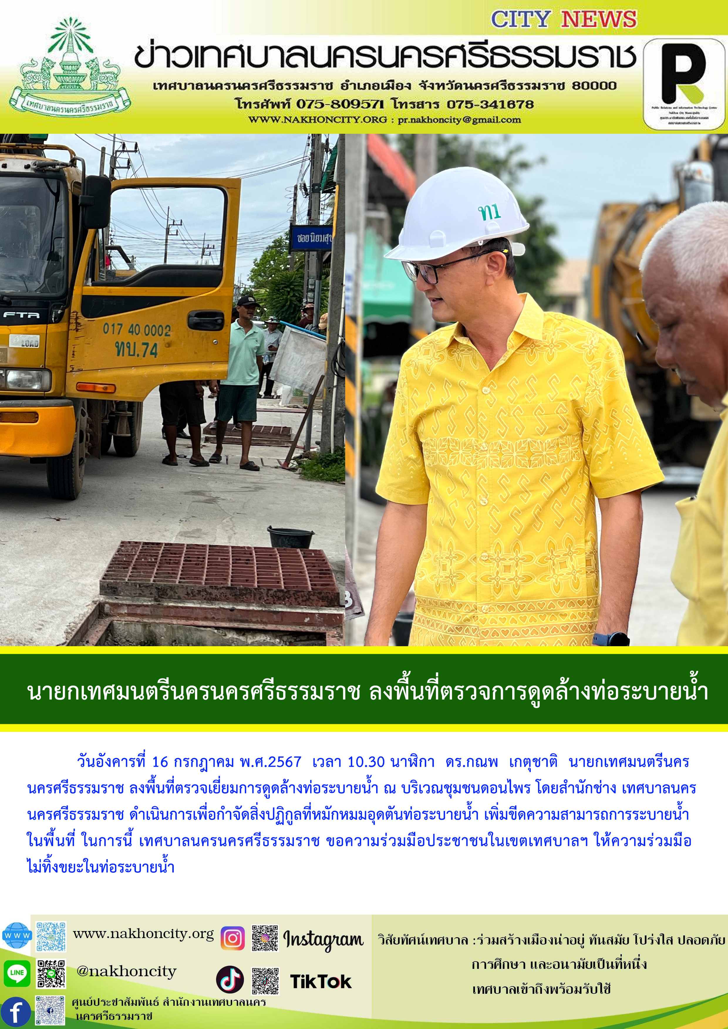 วันอังคารที่ 16 กรกฎาคม พ.ศ.2567 เวลา 10.30 นาฬิกา ดร.กณพ เกตุชาติ นายกเทศมนตรีนคร นครศรีธรรมราช ลงพื้นที่ตรวจเยี่ยมการดูดล้างท่อระบายน้ำ ณ บริเวณชุมชนดอนไพร โดยสำนักช่าง เทศบาลนครนครศรีธรรมราช ดำเนินการเพื่อกำจัดสิ่งปฏิกูลที่หมักหมมอุดตันท่อระบายน้ำ เพิ่มขีดความสามารถการระบายน้ำในพื้นที่ ในการนี้ เทศบาลนครนครศรีธรรมราช ขอความร่วมมือประชาชนในเขตเทศบาลฯ ให้ความร่วมมือไม่ทิ้งขยะในท่อระบายน้ำ