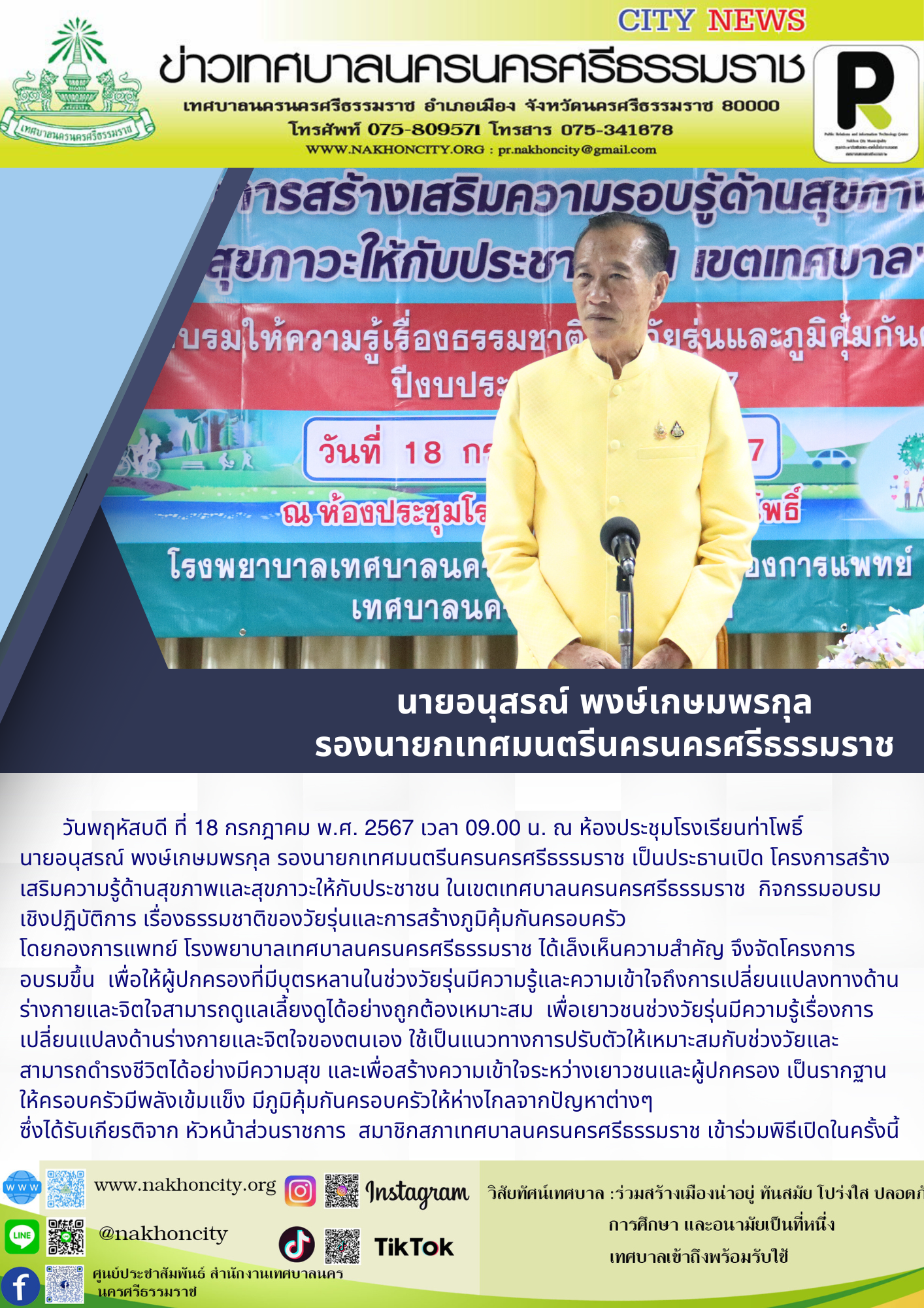 นายอนุสรณ์ พงษ์เกษมพรกุล รองนายกเทศมนตรีนครนครศรีธรรมราช เป็นประธานเปิด โครงการสร้างเสริมความรู้ด้านสุขภาพและสุขภาวะให้กับประชาชน ในเขตเทศบาลนครนครศรีธรรมราช กิจกรรมอบรมเชิงปฏิบัติการ เรื่องธรรมชาติของวัยรุ่นและการสร้างภูมิคุ้มกันครอบครัว |