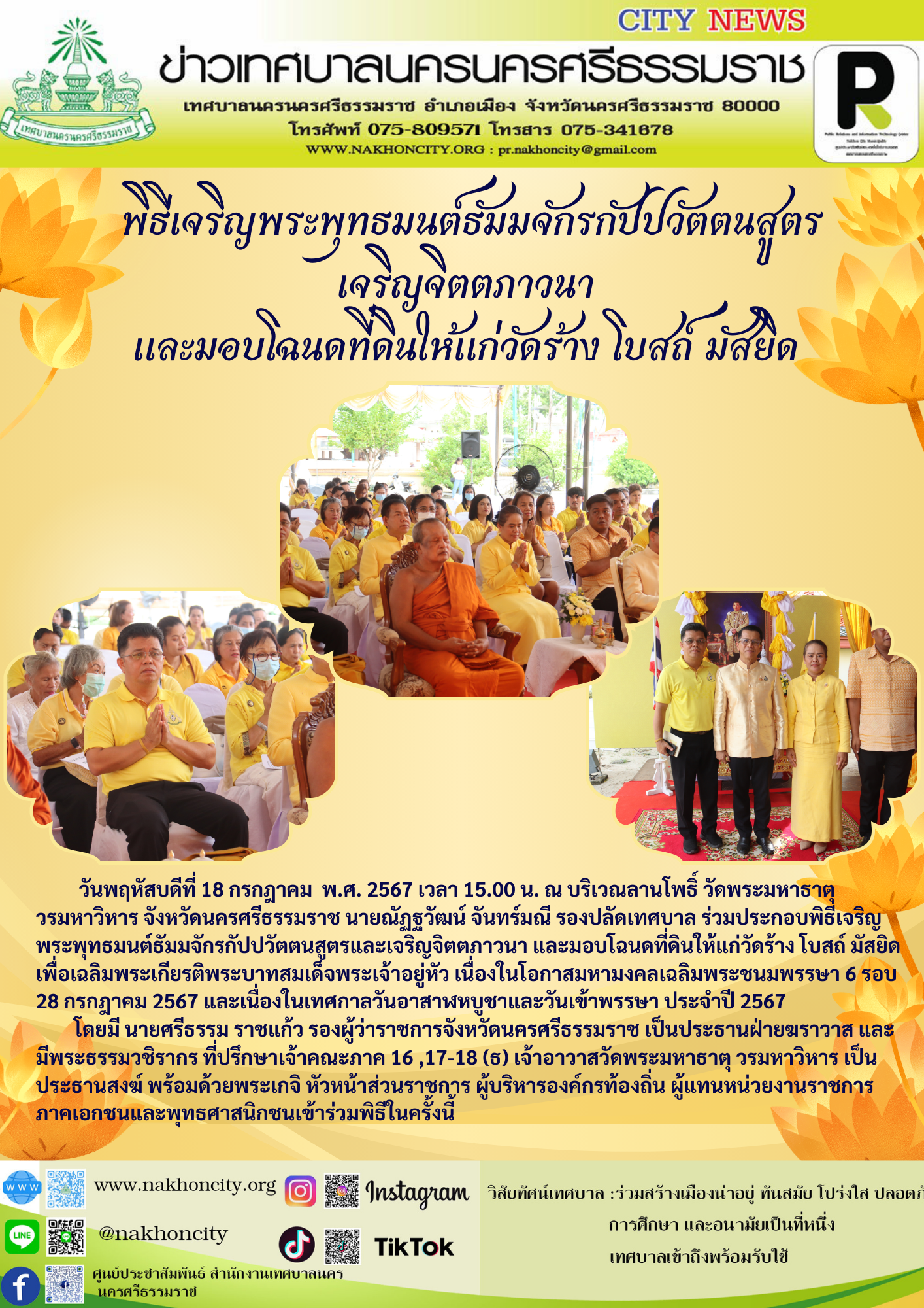 วันพฤหัสบดีที่ 18 กรกฎาคม พ.ศ. 2567 เวลา 15.00 น. ณ บริเวณลานโพธิ์ วัดพระมหาธาตุ วรมหาวิหาร จังหวัดนครศรีธรรมราช นายณัฏฐวัฒน์ จันทร์มณี รองปลัดเทศบาล ร่วมประกอบพิธีเจริญพระพุทธมนต์ธัมมจักรกัปปวัตตนสูตรและเจริญจิตตภาวนา และมอบโฉนดที่ดินให้แก่วัดร้าง โบสถ์ มัสยิด เพื่อเฉลิมพระเกียรติพระบาทสมเด็จพระเจ้าอยู่หัว เนื่องในโอกาสมหามงคลเฉลิมพระชนมพรรษา 6 รอบ 28 กรกฎาคม 2567 และเนื่องในเทศกาลวันอาสาฬหบูชาและวันเข้าพรรษา ประจำปี 2567 โดยมี นายศรีธรรม ราชแก้ว รองผู้ว่าราชการจังหวัดนครศรีธรรมราช เป็นประธานฝ่ายฆราวาส และมีพระธรรมวชิรากร ที่ปรึกษาเจ้าคณะภาค 16 ,17-18 (ธ) เจ้าอาวาสวัดพระมหาธาตุ วรมหาวิหาร เป็นประธานสงฆ์ พร้อมด้วยพระเกจิ หัวหน้าส่วนราชการ ผู้บริหารองค์กรท้องถิ่น ผู้แทนหน่วยงานราชการ ภาคเอกชนและพุทธศาสนิกชนเข้าร่วมพิธีในครั้งนี้ |